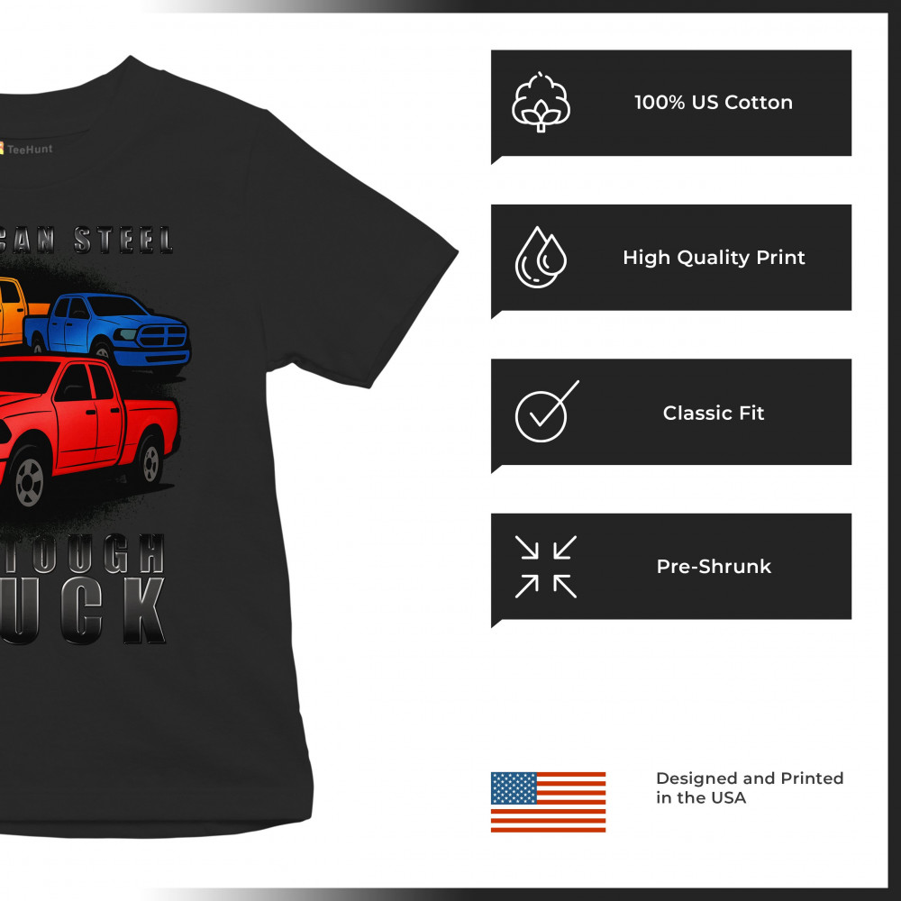 Celebrate the power of American steel with this rugged design featuring three bold pickup trucks in red, yellow, and blue. Made for gearheads, road warriors, and those who respect durability and performance. Perfect for truck shows, off-road events, and meetups.