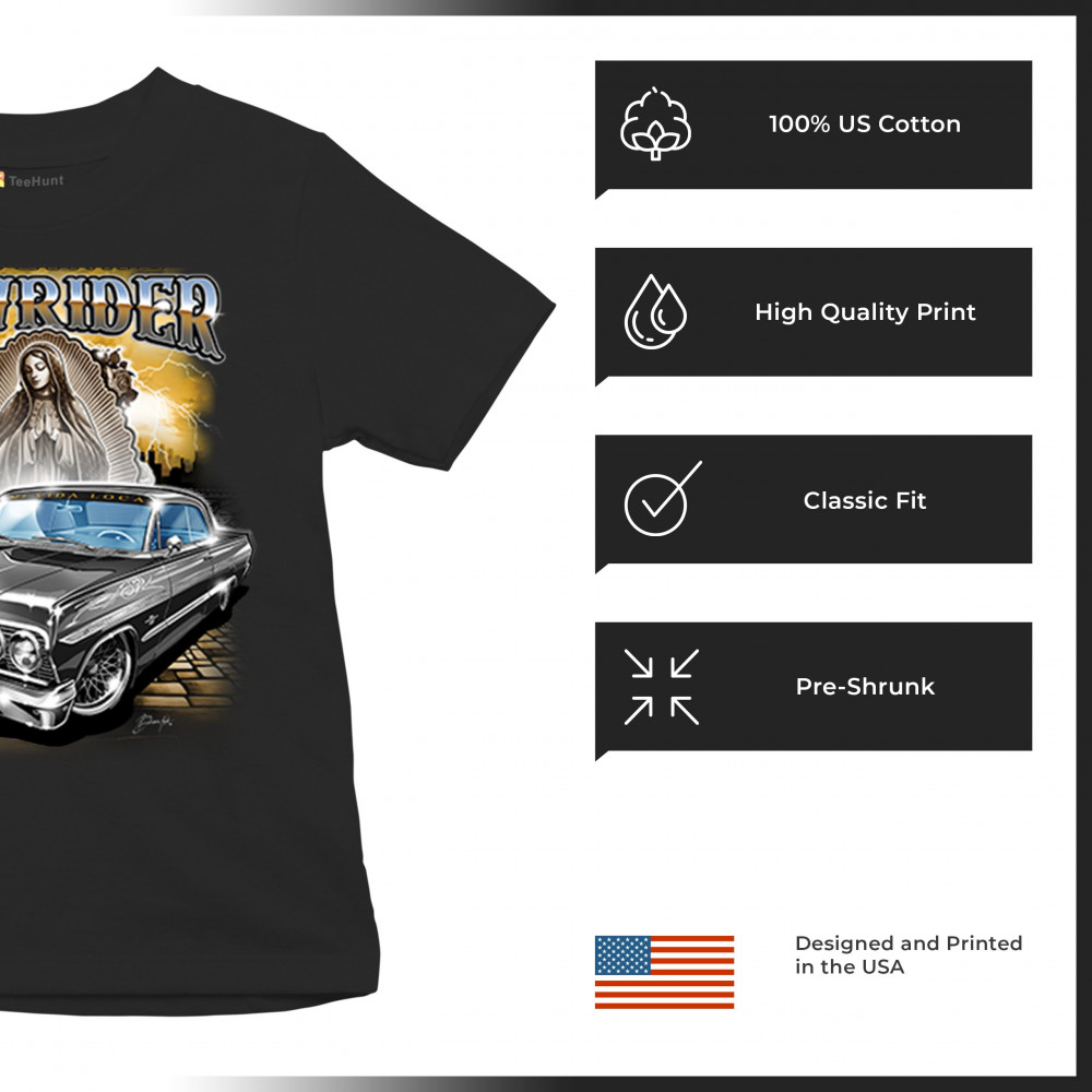 Unleash your love for custom cars with our "Original Lowrider" t-shirt. Showcasing a meticulously detailed 1964 lowrider, this shirt is a must-have for anyone passionate about car culture and street art. Whether you're attending a car show, hitting the streets, or just hanging out, this tee combines style and comfort. Made from premium materials, it ensures lasting quality and a great fit. Make your wardrobe stand out with this iconic lowrider design.