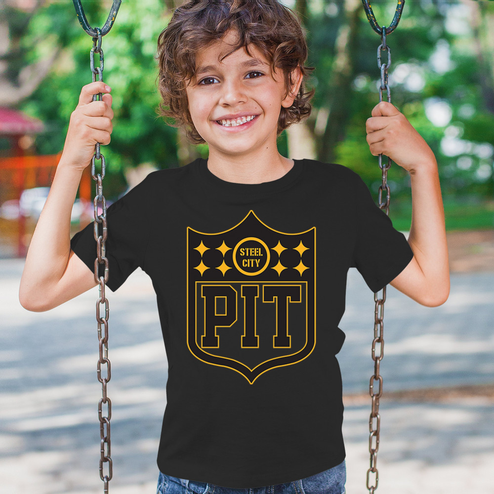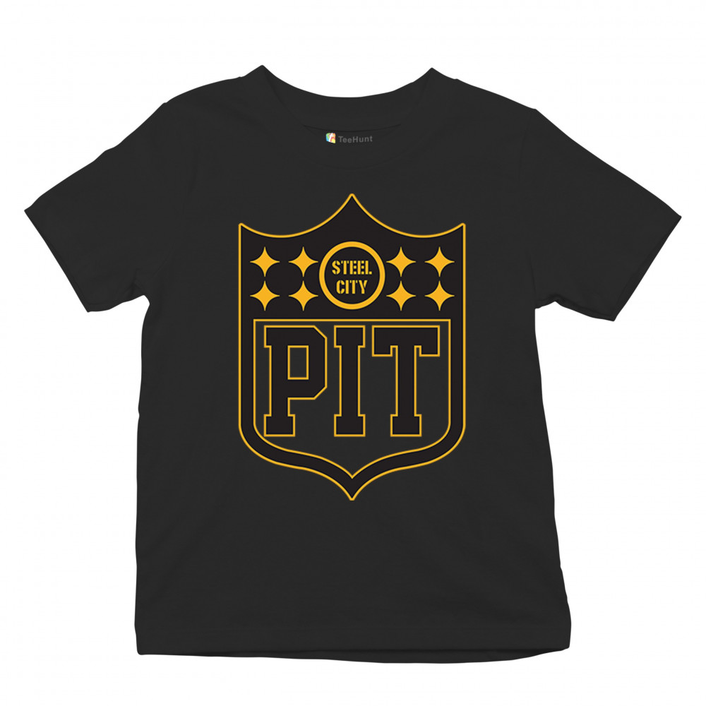 Steel City PIT shield football gear celebrating Pittsburgh football nation, gridiron tradition, playoff vibes, and sports heritage.