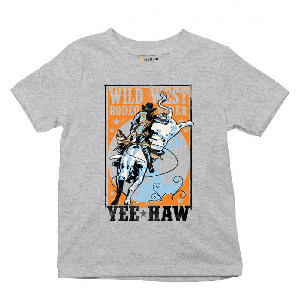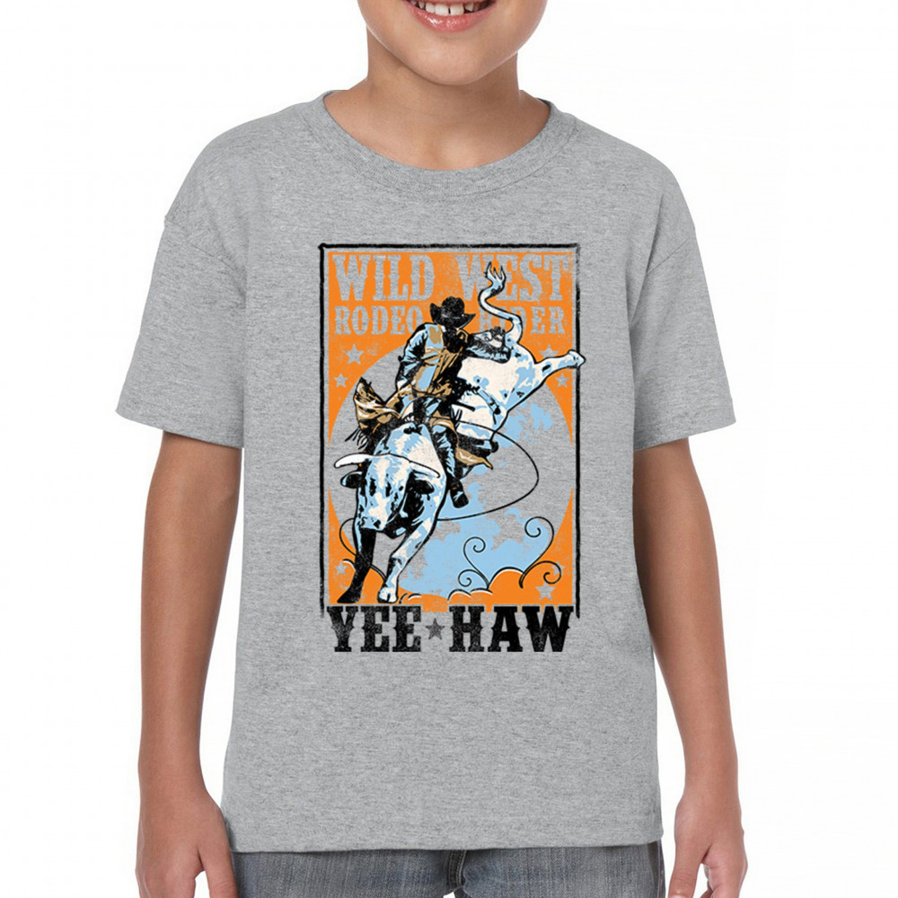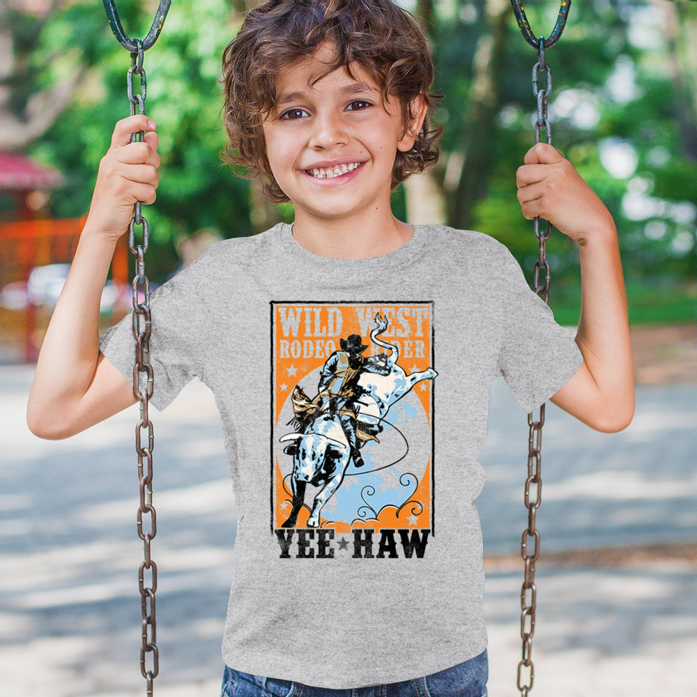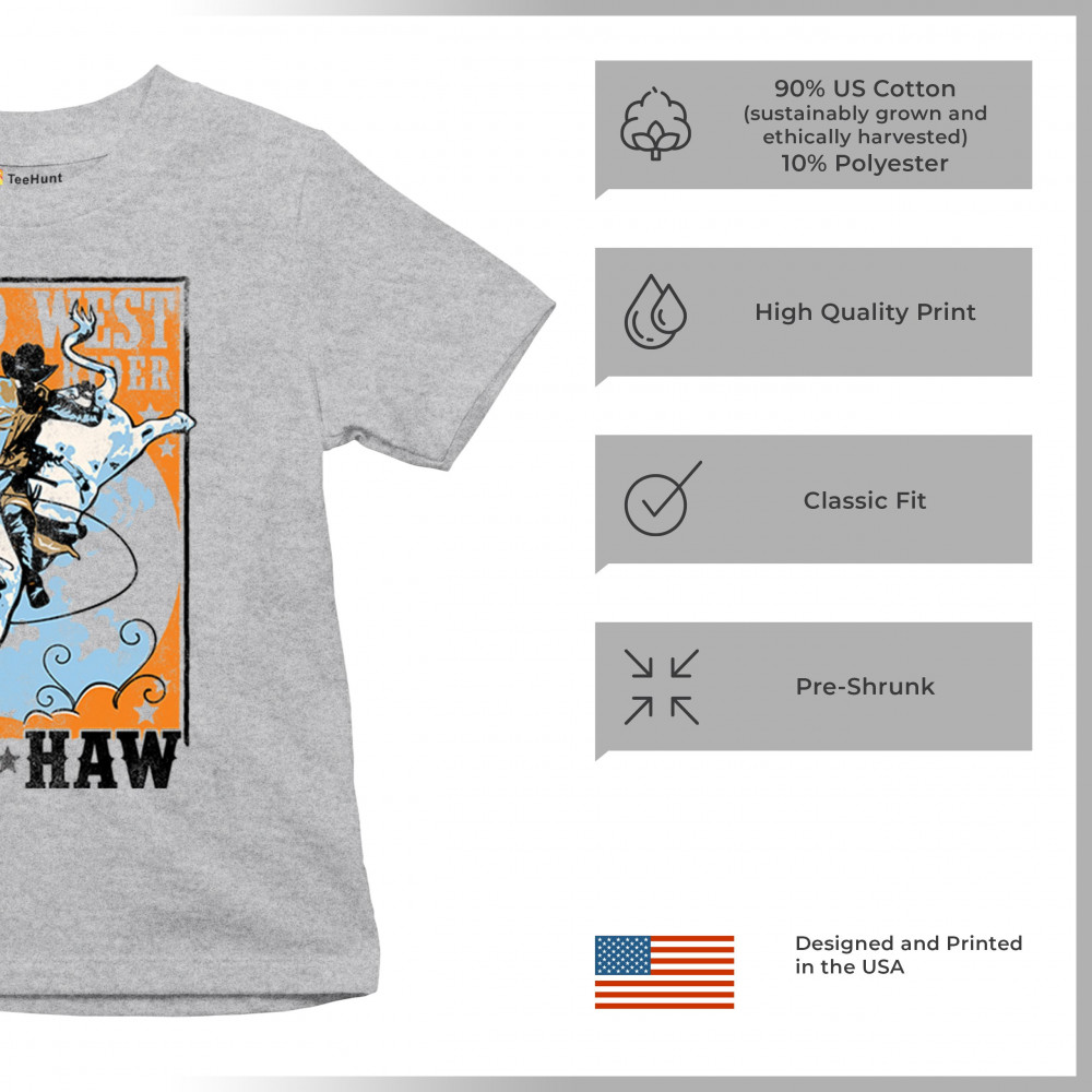 Bold cowboy bull riding design with orange backdrop, perfect for rodeo fans, western events, and country festivals.