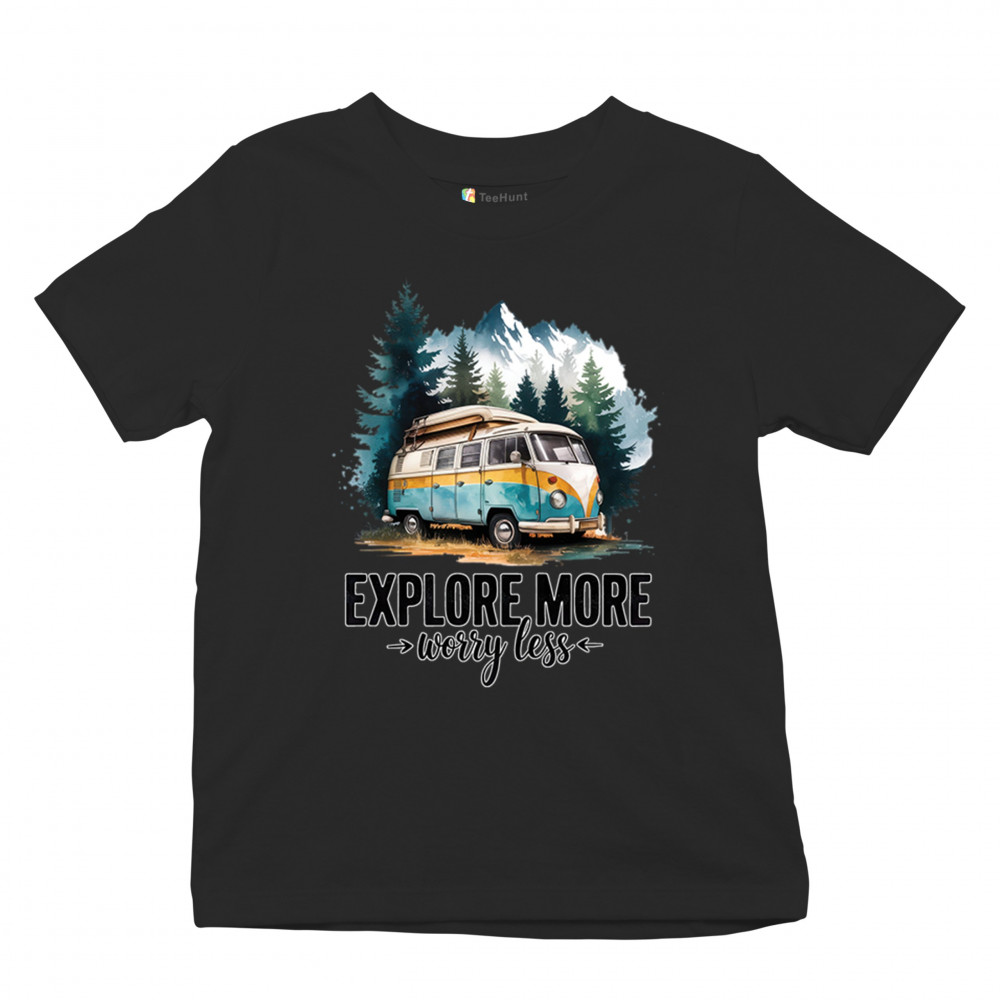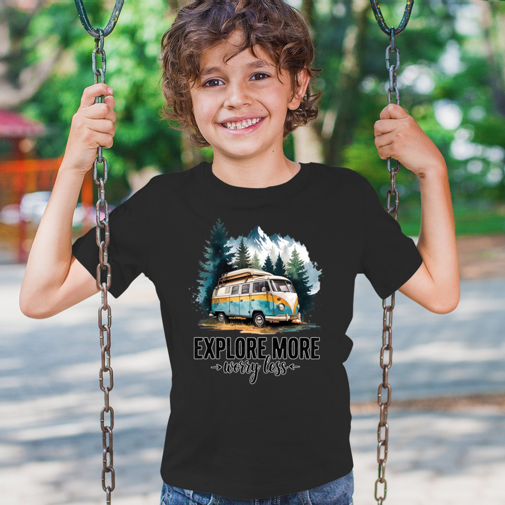 EXPLORE MORE WORRY LESS youth t-shirt camping trail hiking tent life kids black