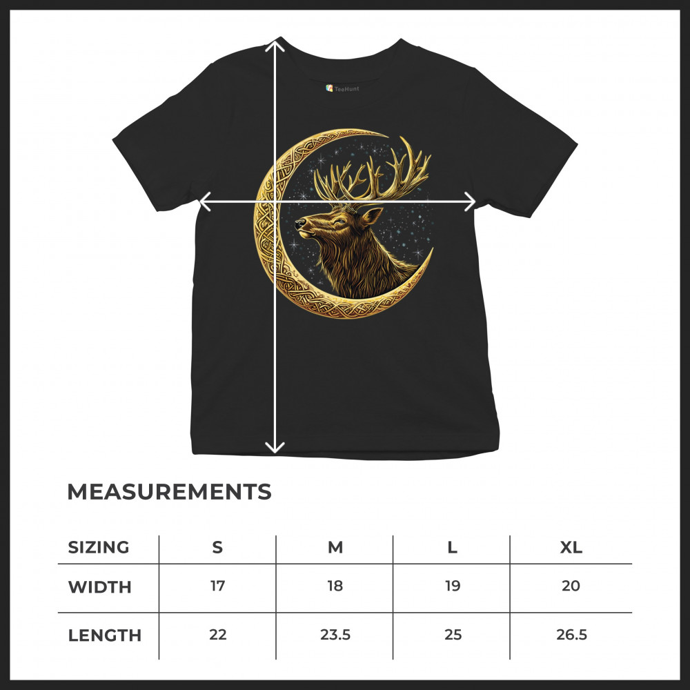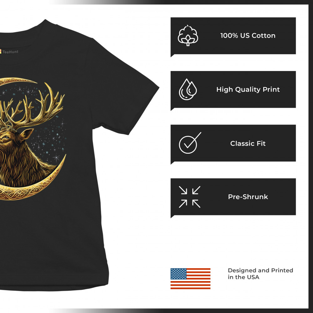 Celtic stag design with golden moon and cosmic stars. Symbolizes forest strength, leadership, and spiritual energy. Perfect for nature lovers.