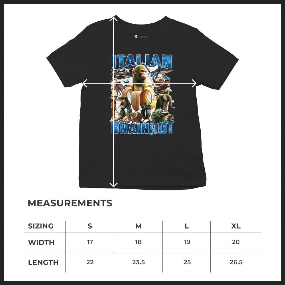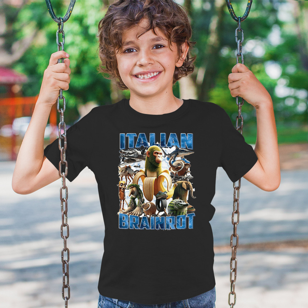 This design captures the full force of Italian brainrot—bananas, sharks, monkeys, and meme beasts collide in an unfiltered internet-core explosion. Perfect for fans of cursed humor, Gen Z trends, absurd fashion, TikTok memes, ironic style, surreal pop art, chaotic culture, digital nonsense, Gen Alpha brainrot, and hyper-online energy.