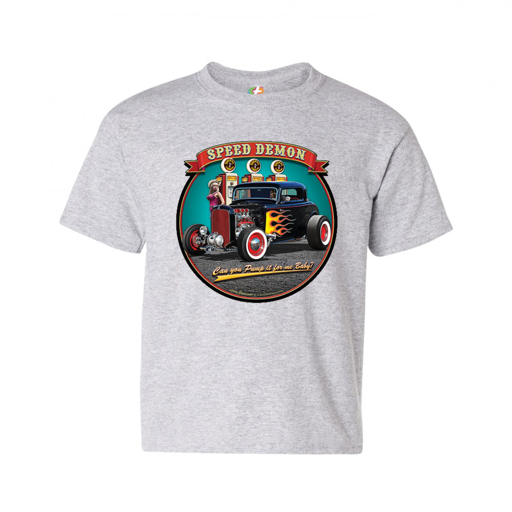 A print featuring a 1932 Ford Deuce hot rod coupe standing by a gas station. There is a cowgirl leaning on a gas pump. The print says: "speed demon" and underneath the car "Can you Pump it for me baby?". A great choice for Route 66 and hot rod fans.