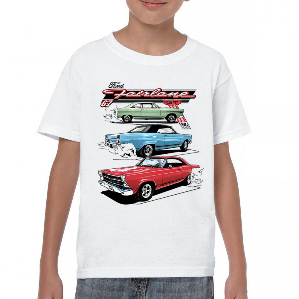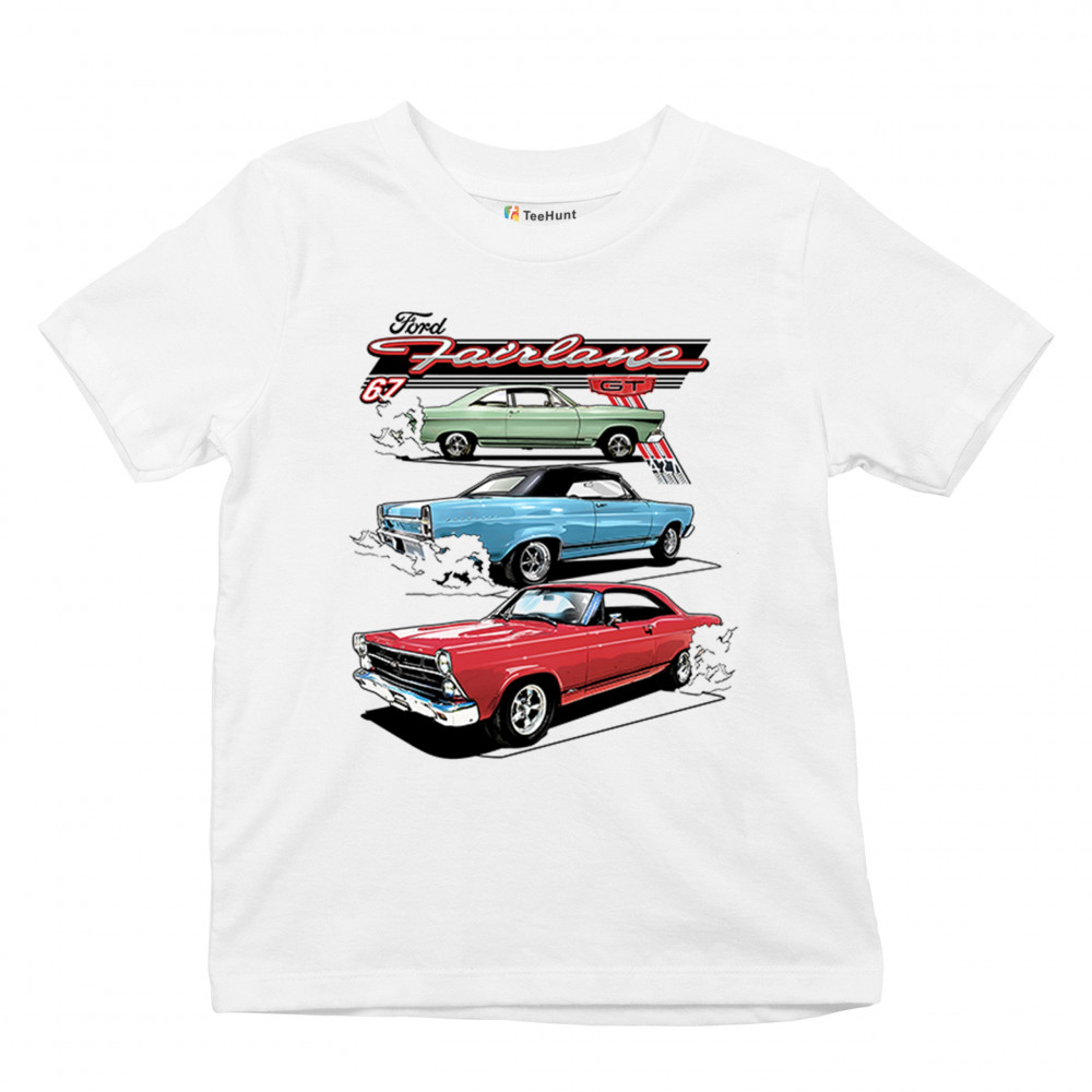 Features three 1967 Ford Fairlane GTs with retro burnout style. Great for muscle car fans, Ford collectors, car shows, and vintage meetups.