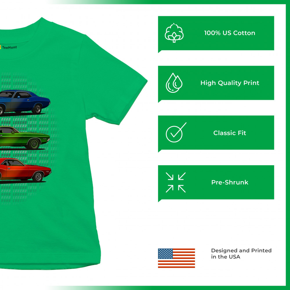 Three bold 1970 muscle cars, stacked in red, green, and blue, celebrate vintage power and road legend status. This retro-inspired design captures the essence of American car culture—made for gearheads, V8 fans, and anyone who lives for classic performance, heritage, and style.