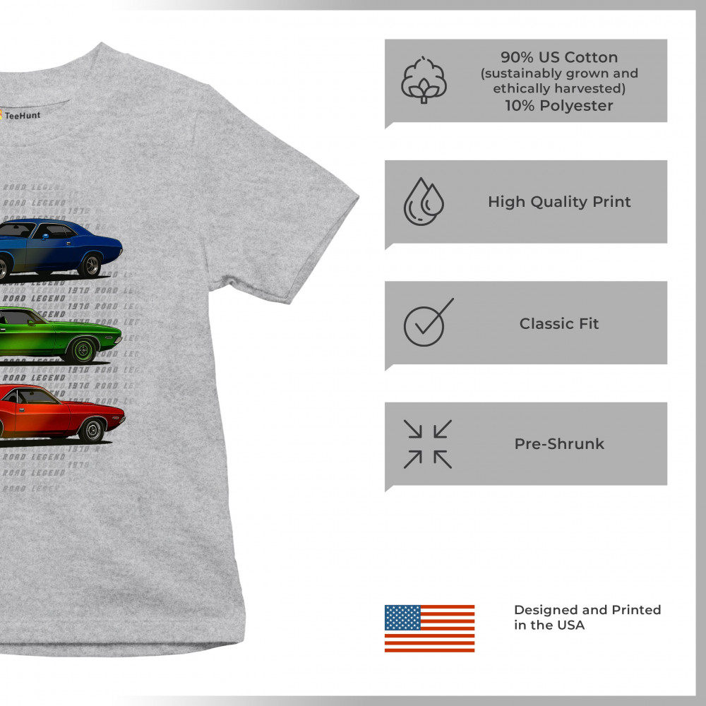 Three bold 1970 muscle cars, stacked in red, green, and blue, celebrate vintage power and road legend status. This retro-inspired design captures the essence of American car culture—made for gearheads, V8 fans, and anyone who lives for classic performance, heritage, and style.