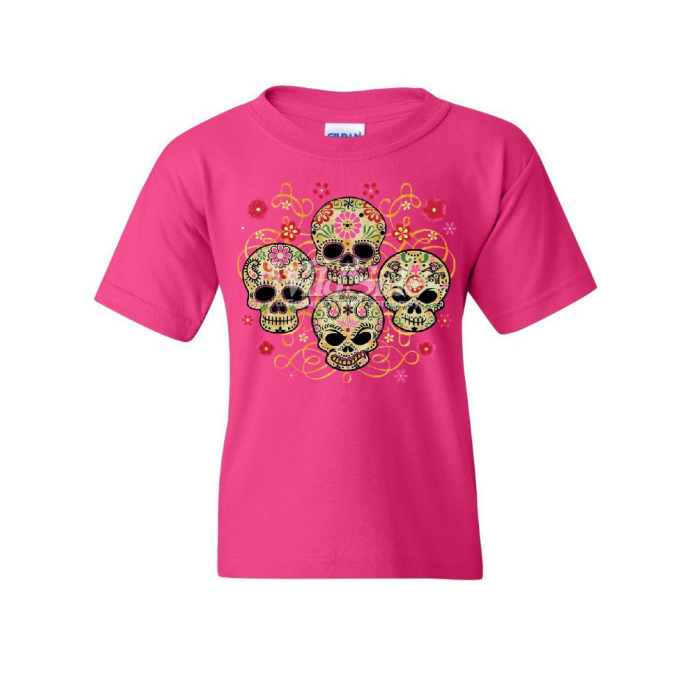 4 CUTE SUGAR SKULLS youth t-shirt calaveras dia de los muertos mexico kids tee pink