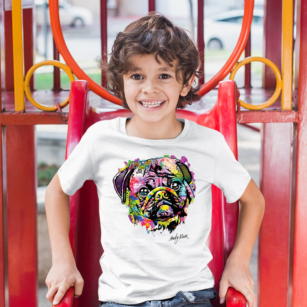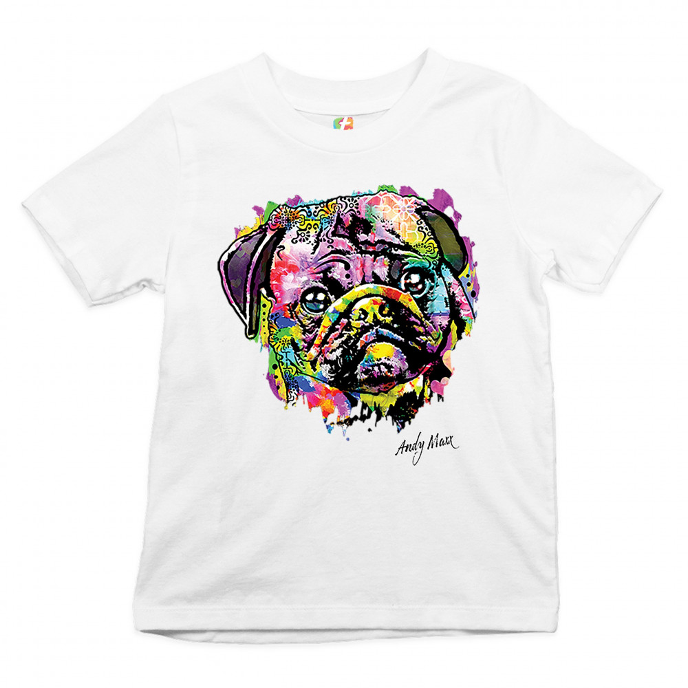 A beautiful print featuring a colorful face of an adorable pug. Below the dog the name of the artist - Andy Maxx - is included. A great choice for a person who is in love with these adorable and gentle dogs.