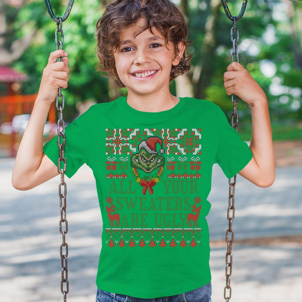 ALL YOUR SWEATERS ARE UGLY youth t-shirt funny merry christmas rudolph kids green