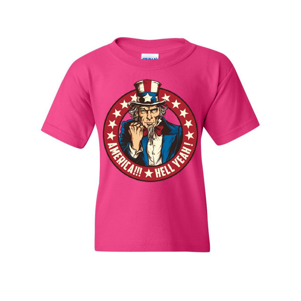 AMERICA HELL YEAH youth t-shirt uncle sam patriotic stars and stripes kids tee pink
