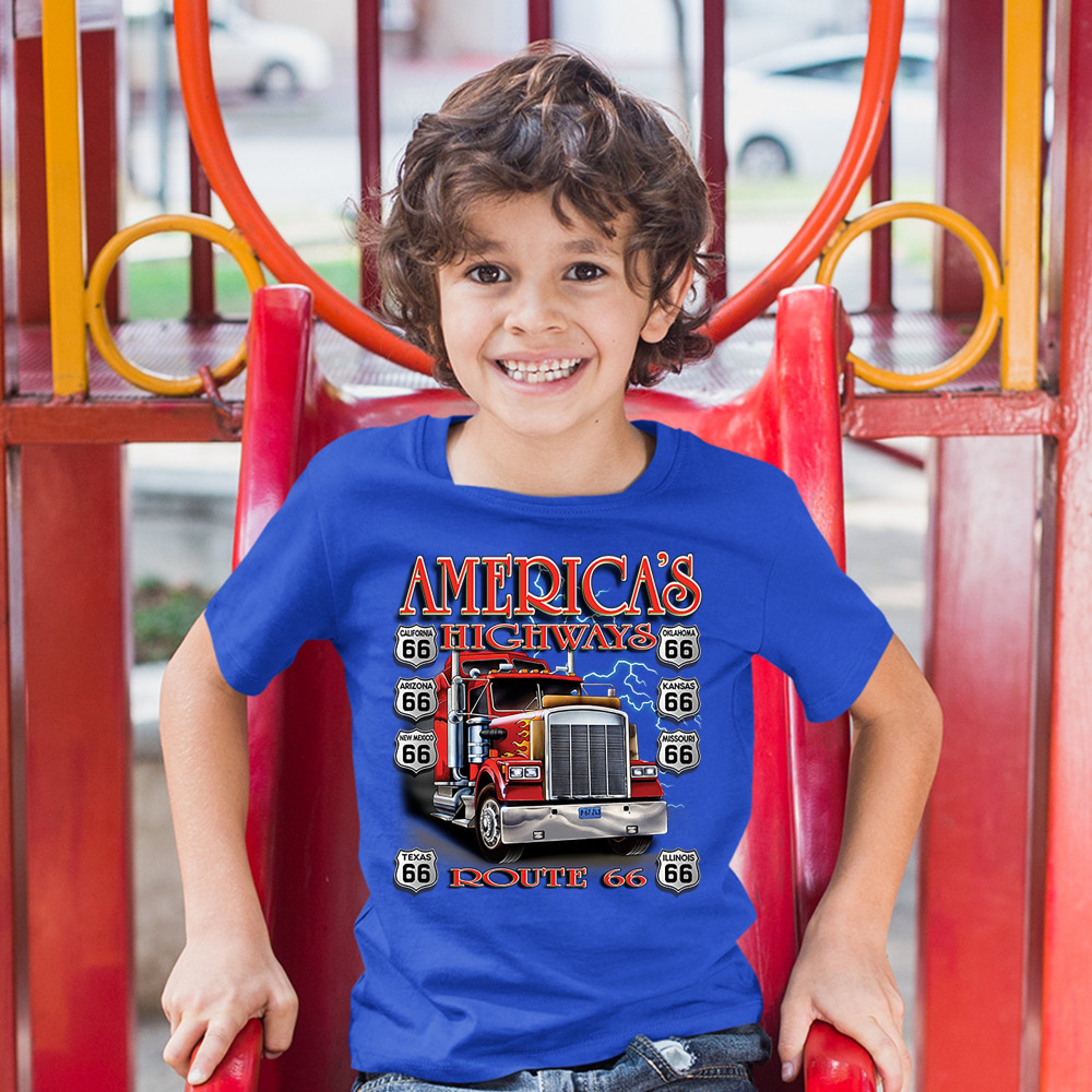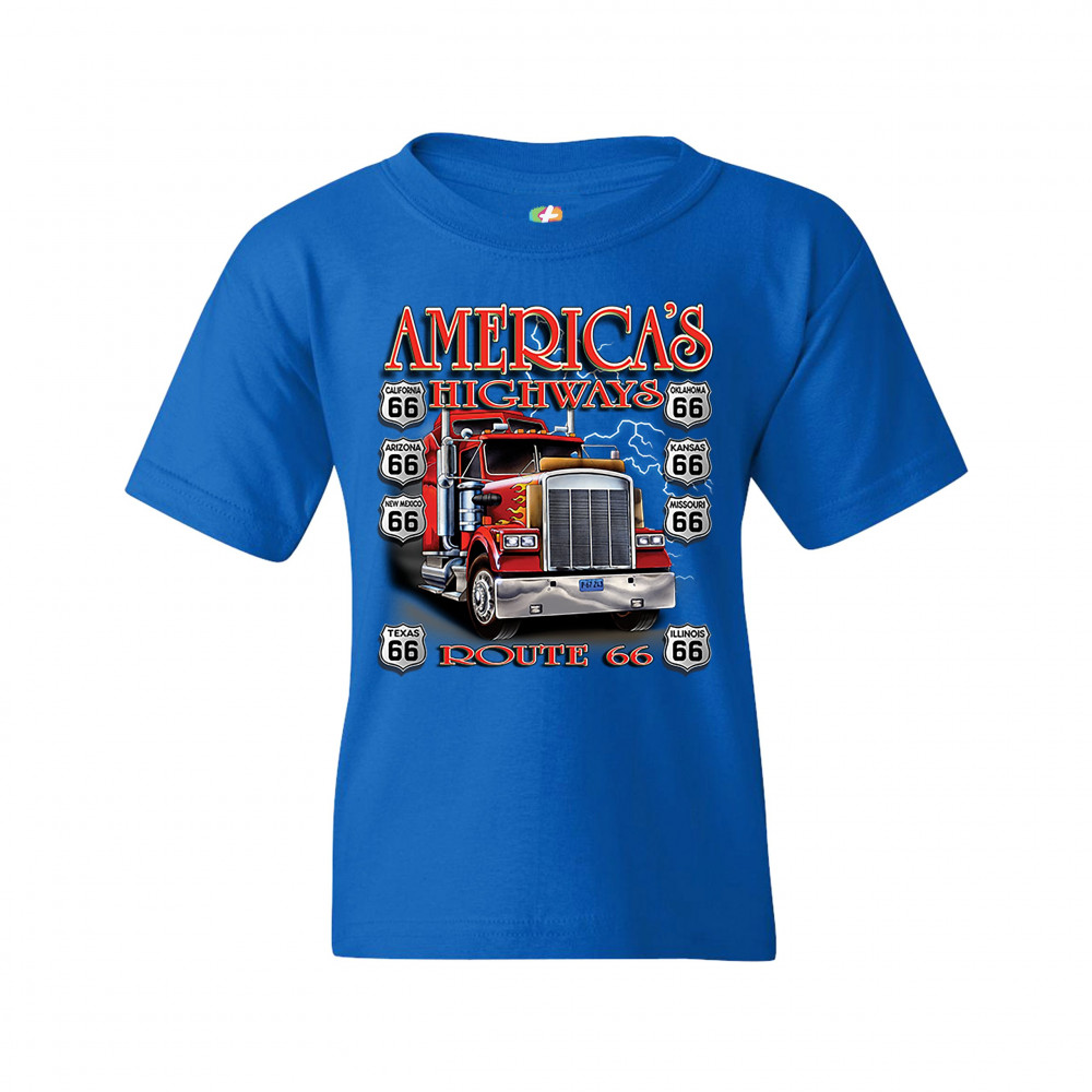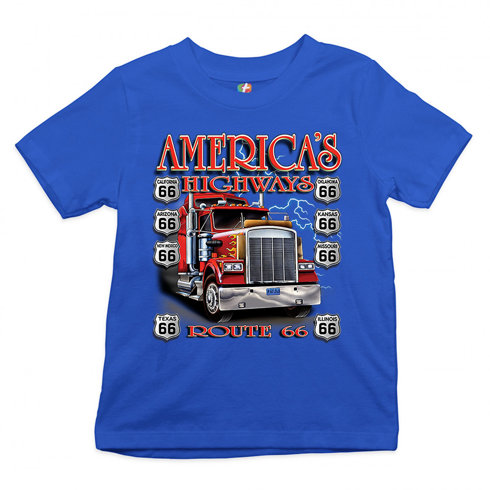 AMERICA'S HIGHWAYS ROUTE 66 youth t-shirt truck driver mechanic teamster kids royal blue
