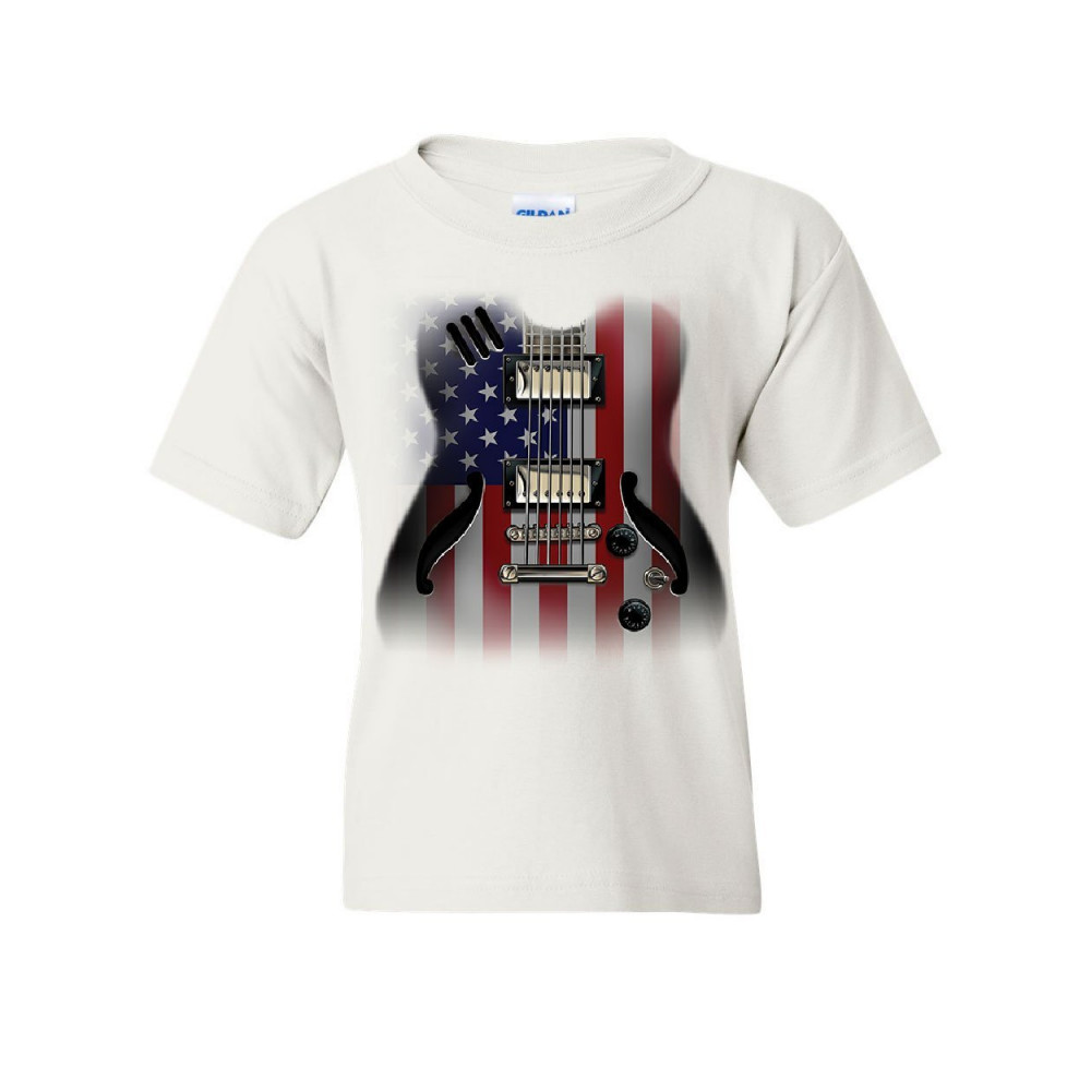 AMERICAN FLAG GUITAR youth t-shirt rock and roll music art 4th of july kids tee white