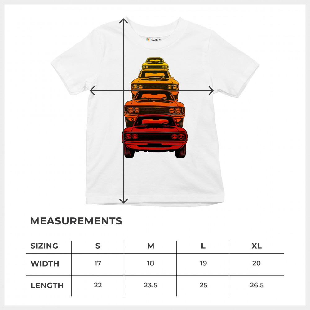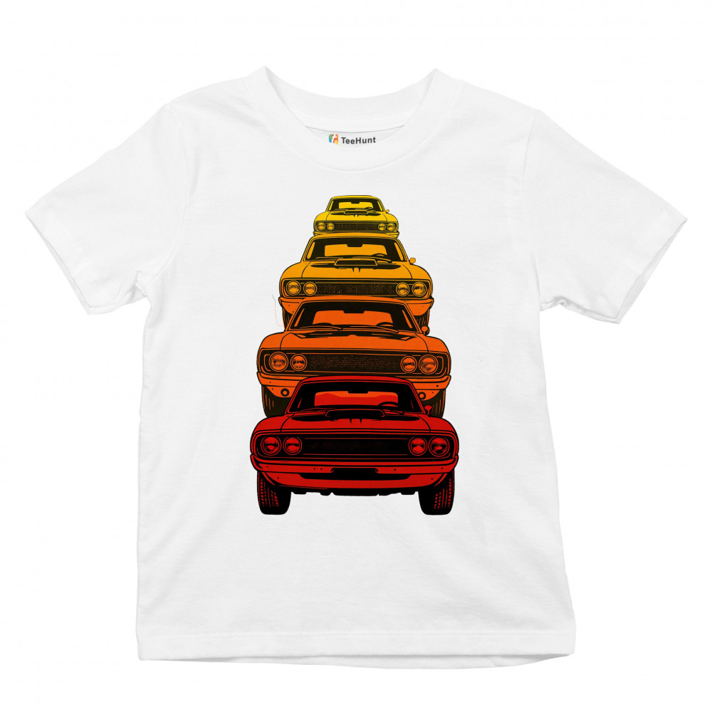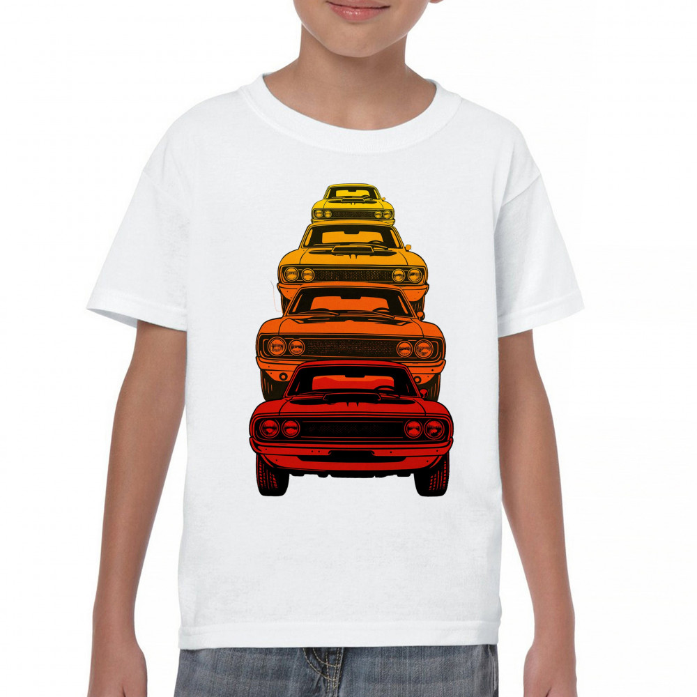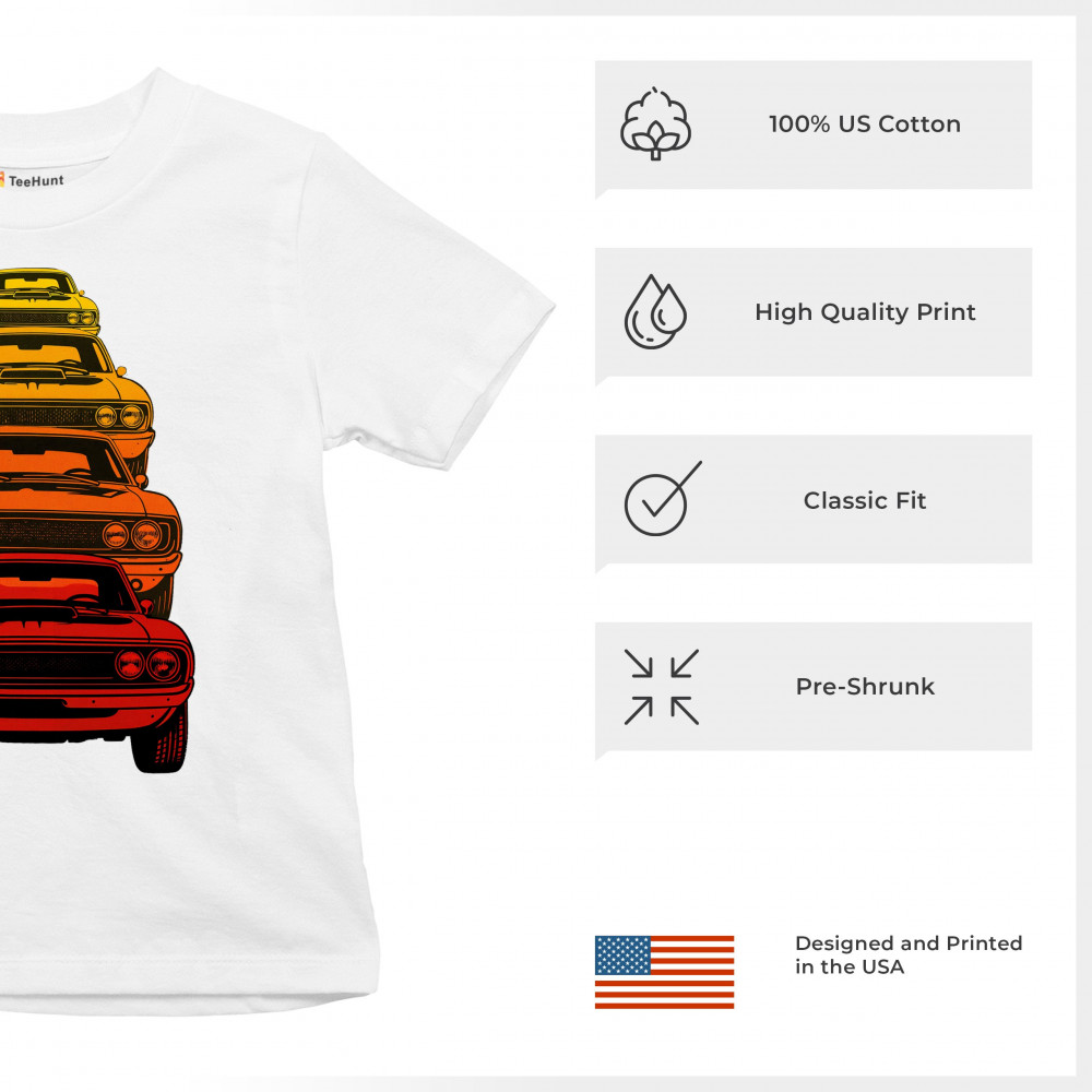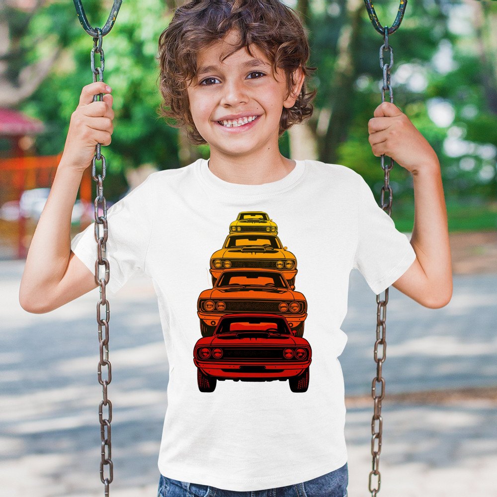 Celebrate horsepower heritage with this colorful lineup of classic muscle cars. Featuring a stacked gradient from red to yellow, this design brings bold retro attitude, V8 pride, and American torque to life. Perfect for collectors, gearheads, and fans of classic car power.
