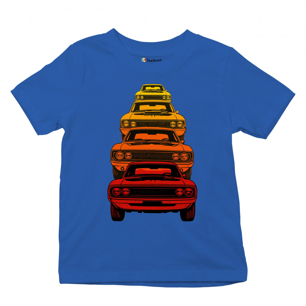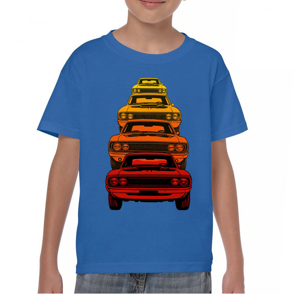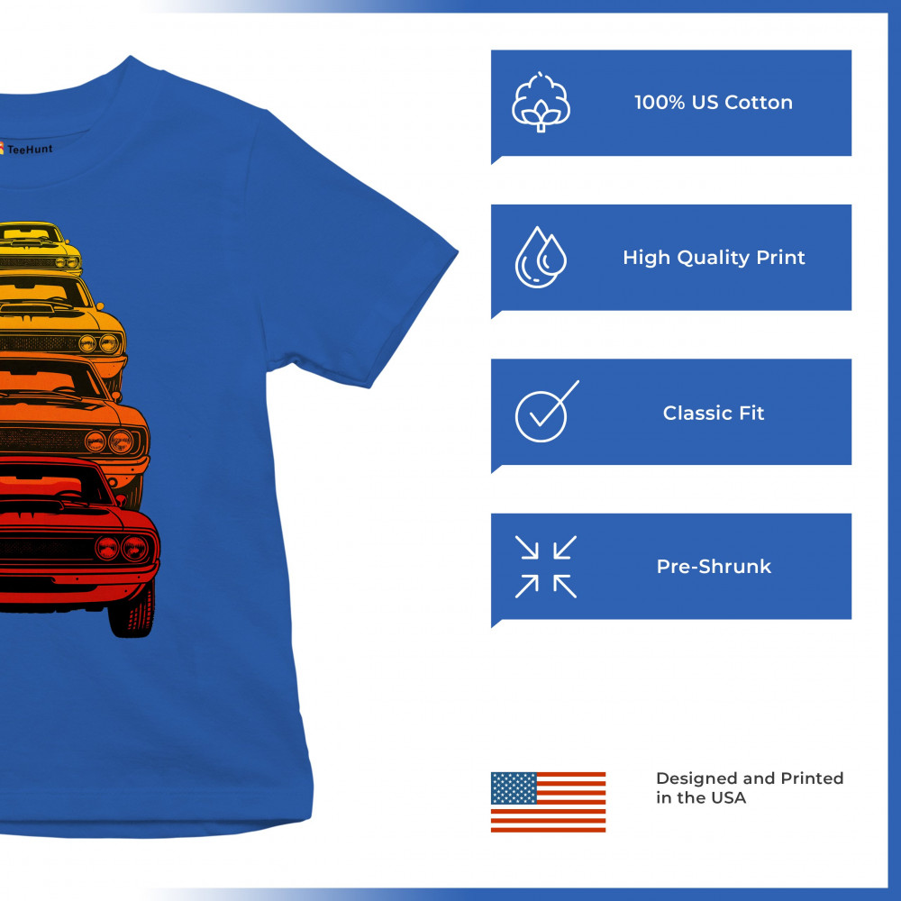 Celebrate horsepower heritage with this colorful lineup of classic muscle cars. Featuring a stacked gradient from red to yellow, this design brings bold retro attitude, V8 pride, and American torque to life. Perfect for collectors, gearheads, and fans of classic car power.