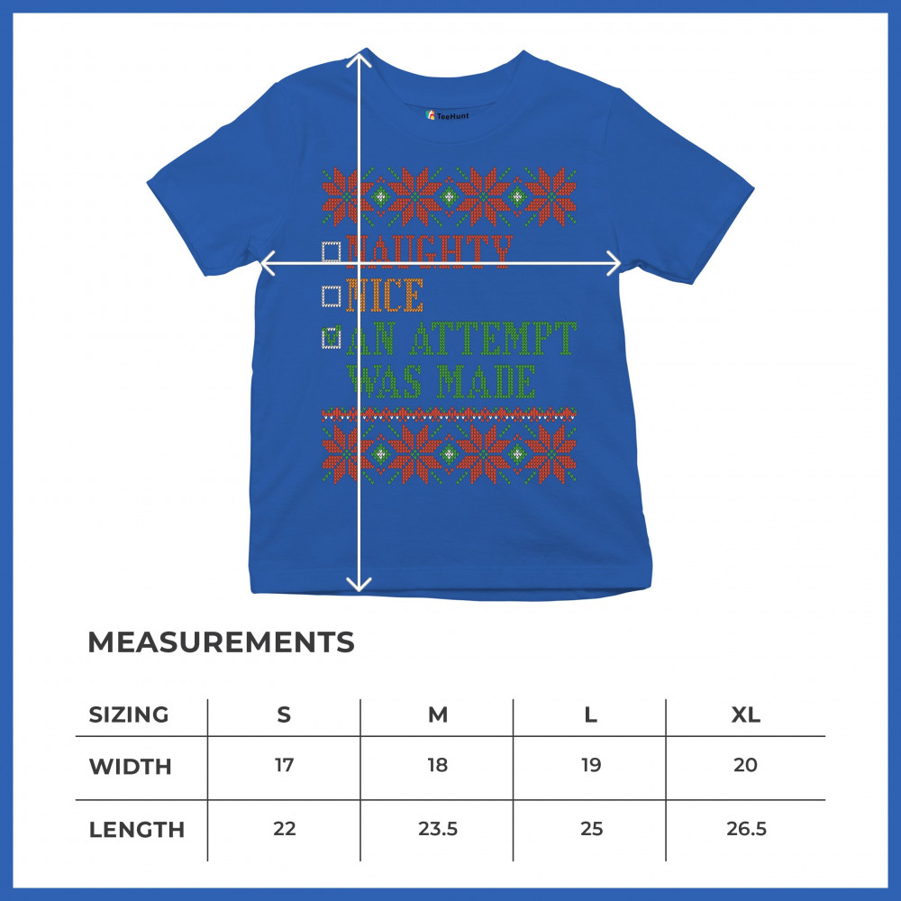 A funny print featuring a check list with options: "Naughty", "Nice" and a checked one "An Attempt Was Made". The print is decorated as an ugly sweater. Amazing choice to make people smile and spread positive vibes on Christmas Eve.