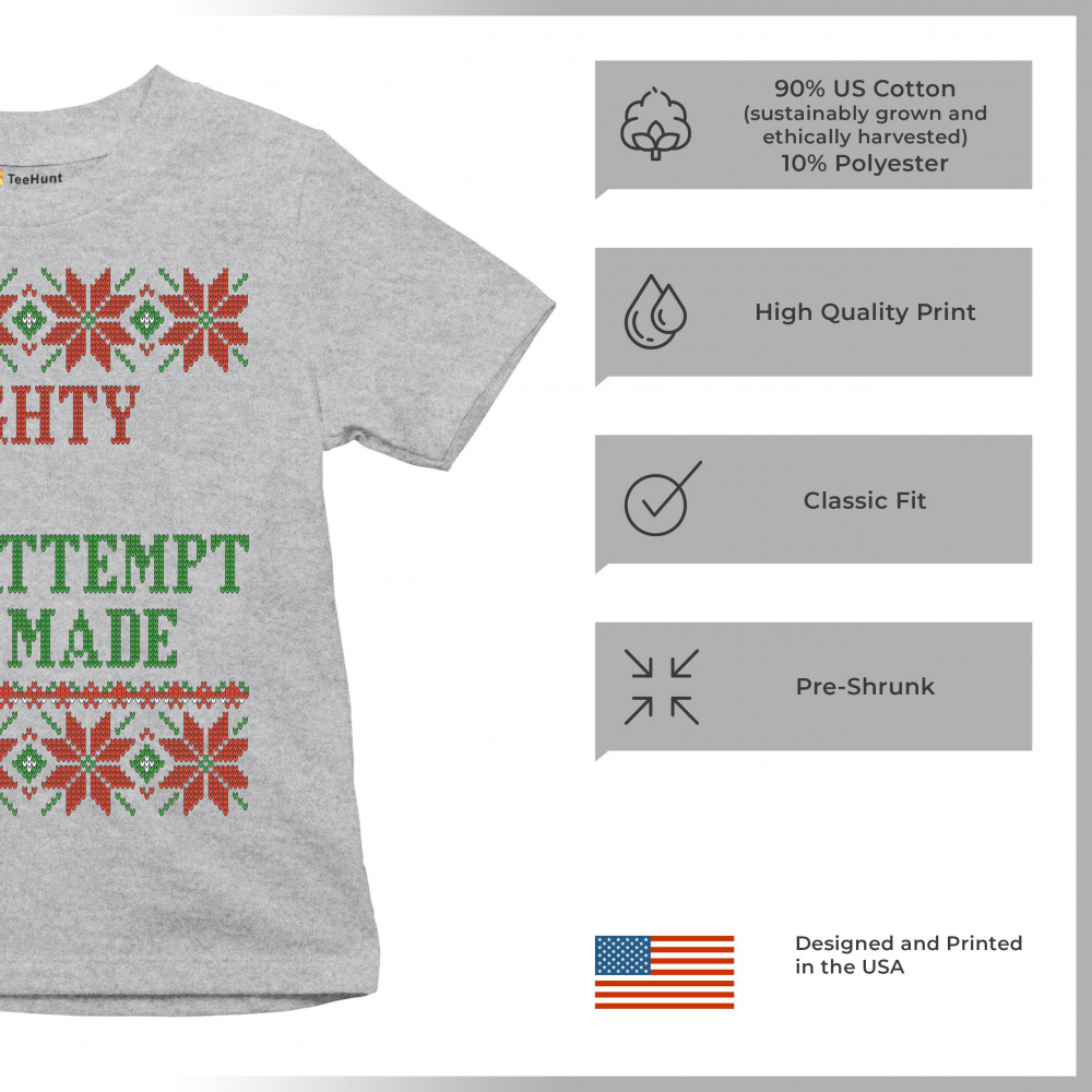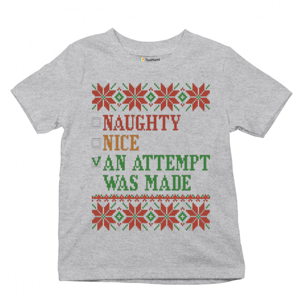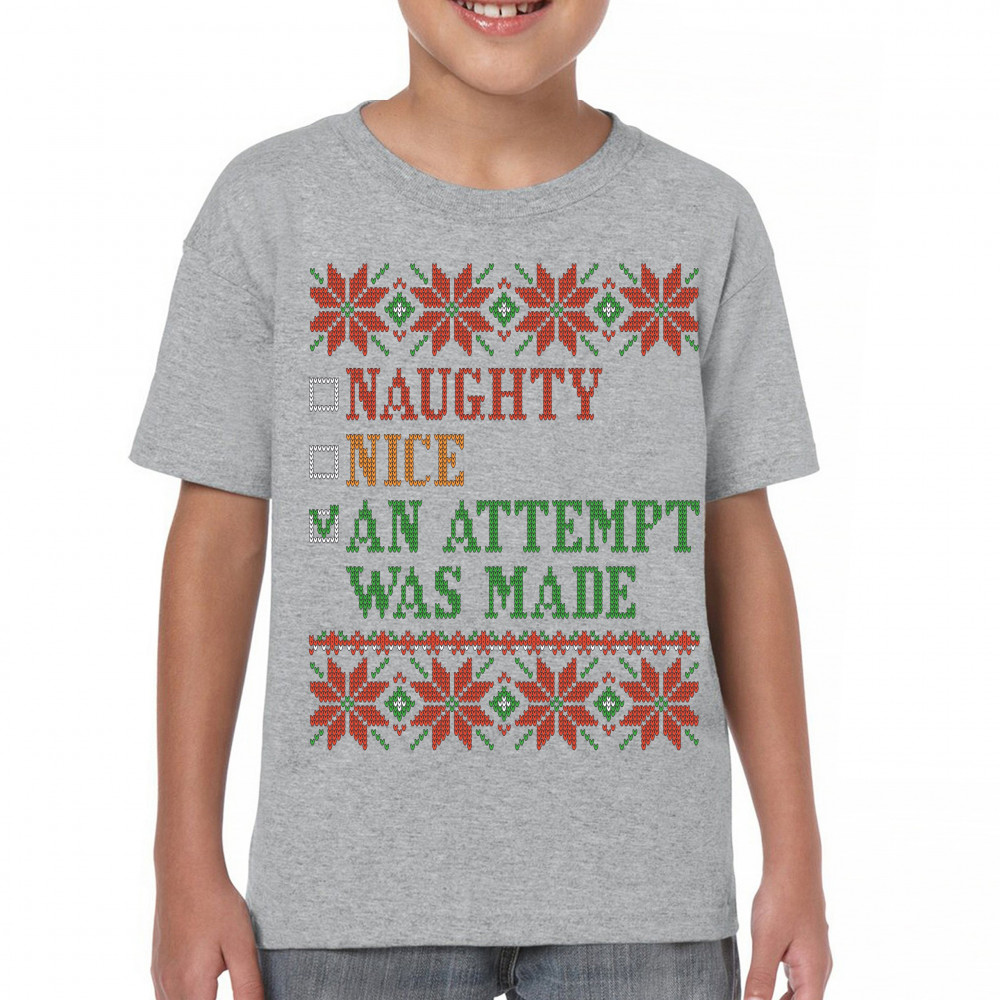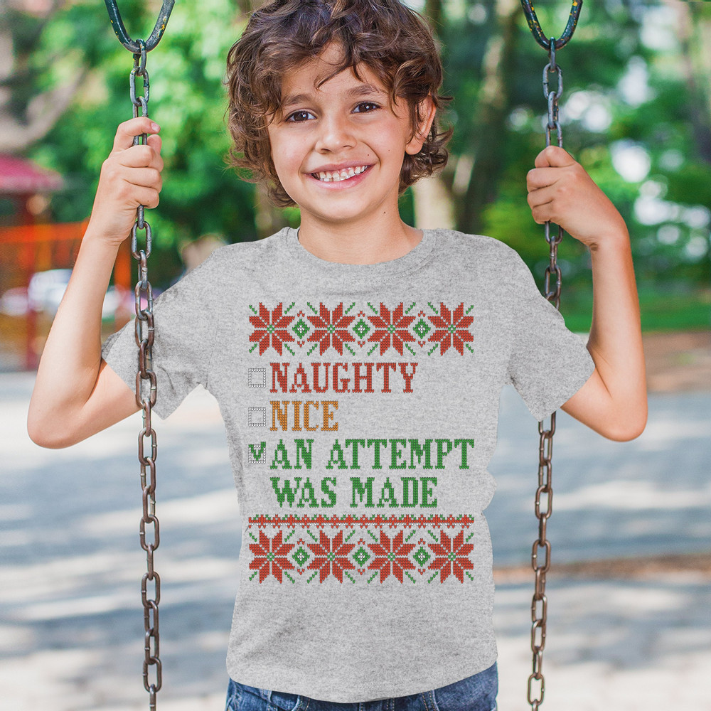 AN ATTEMPT WAS MADE youth t-shirt ugly sweater naughty or nice christmas kids gray