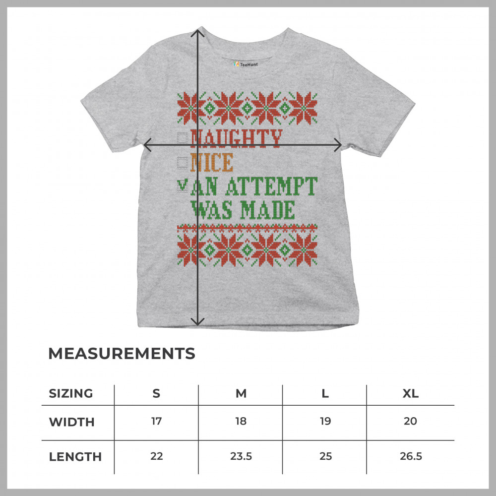 A funny print featuring a check list with options: "Naughty", "Nice" and a checked one "An Attempt Was Made". The print is decorated as an ugly sweater. Amazing choice to make people smile and spread positive vibes on Christmas Eve.