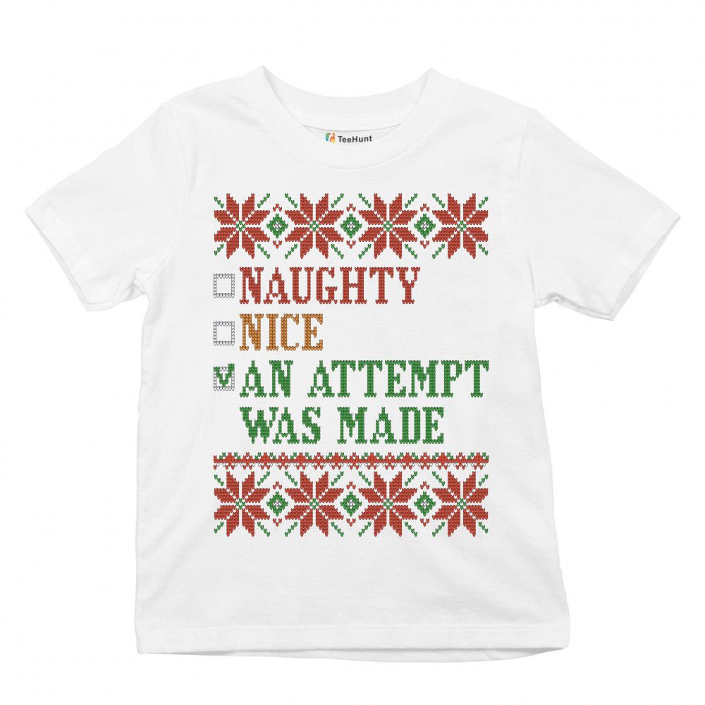 A funny print featuring a check list with options: "Naughty", "Nice" and a checked one "An Attempt Was Made". The print is decorated as an ugly sweater. Amazing choice to make people smile and spread positive vibes on Christmas Eve.