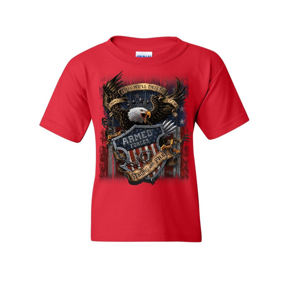 ARMED FORCES BALD EAGLE youth t-shirt army this we'll defend us flag kids tee red