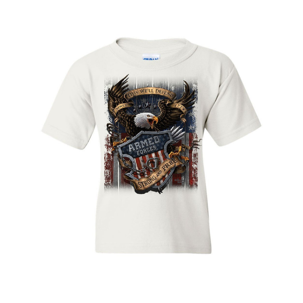ARMED FORCES BALD EAGLE youth t-shirt army this we'll defend us flag kids tee white