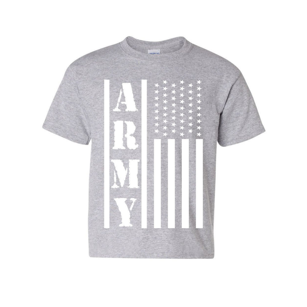 ARMY FLAG MILITARY youth t-shirt patriot veteran stars & stripes honor kids tee gray
