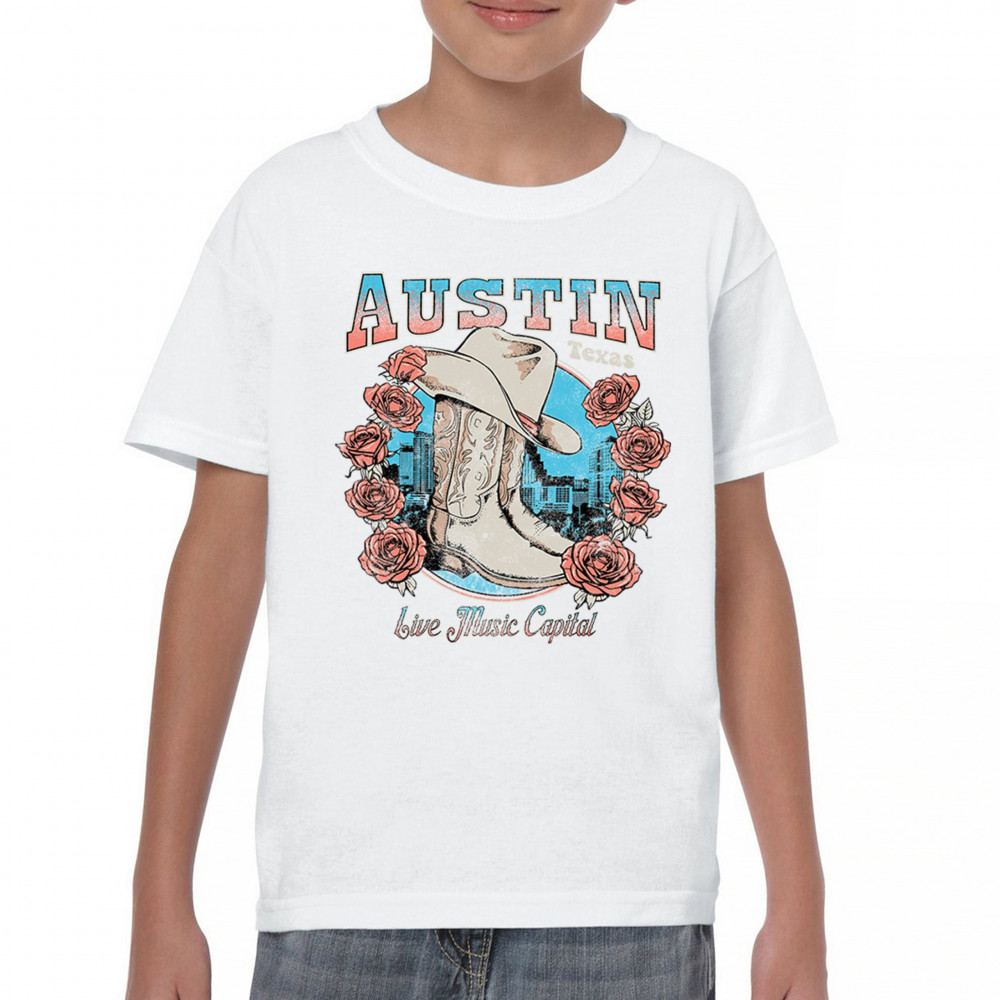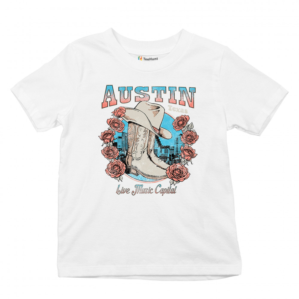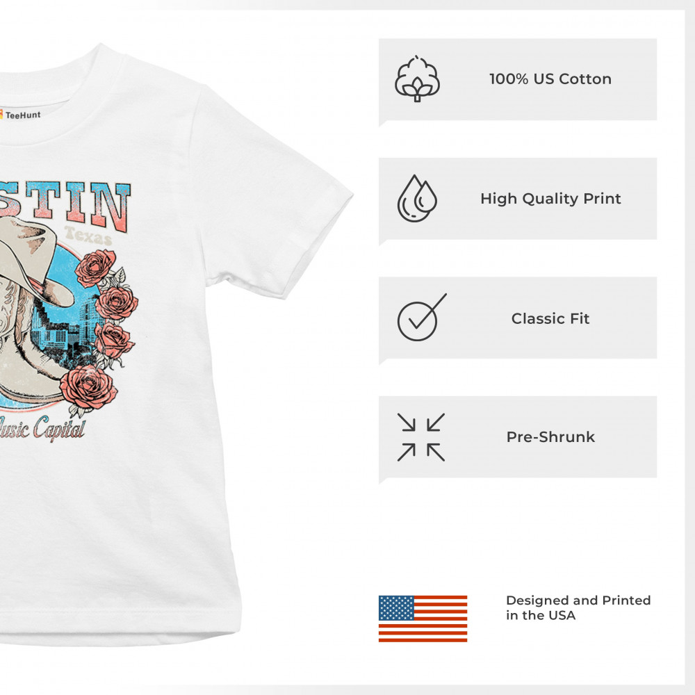 Austin TX Live Music Capital comes alive in this vintage cowgirl boots and hat design, accented by roses and the city skyline. Perfect for lovers of country music, honkytonk vibes, and western chic, this design embodies southern spirit, rustic grit, and the proud Americana aesthetic of Texas’ iconic music scene.