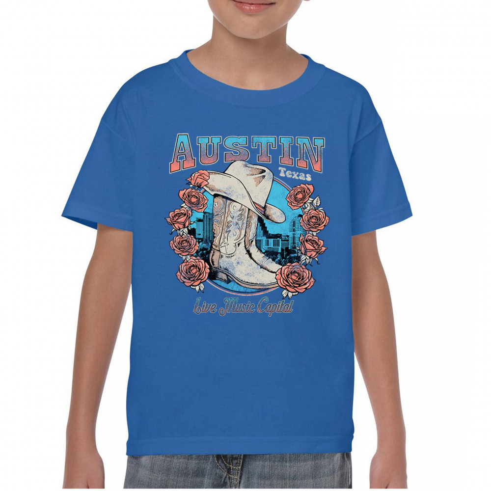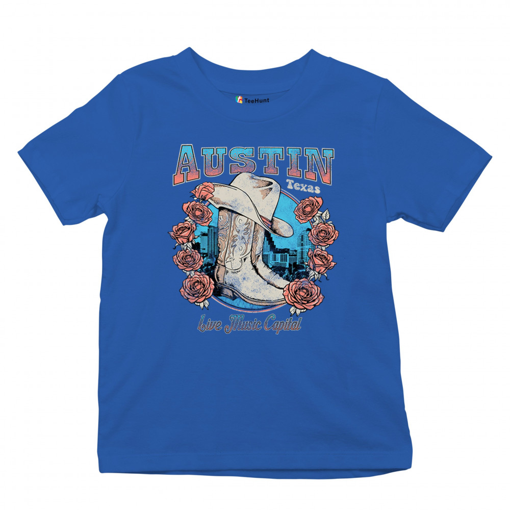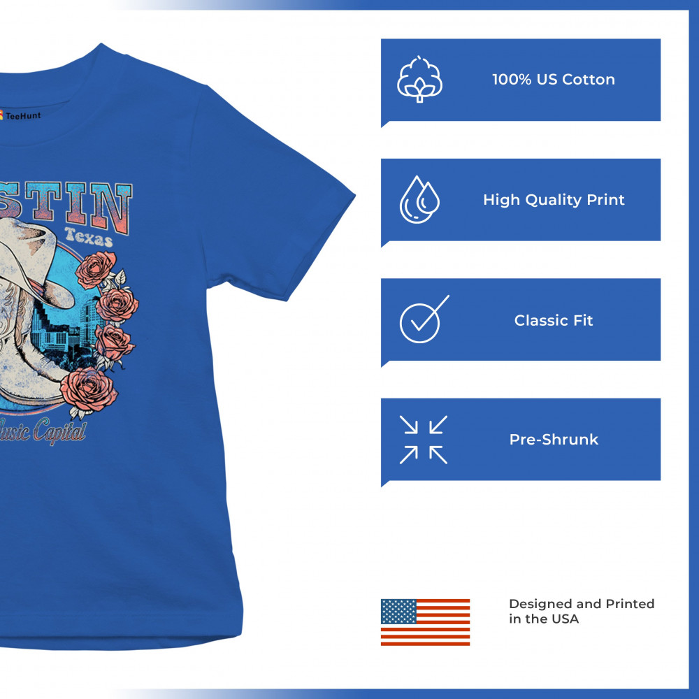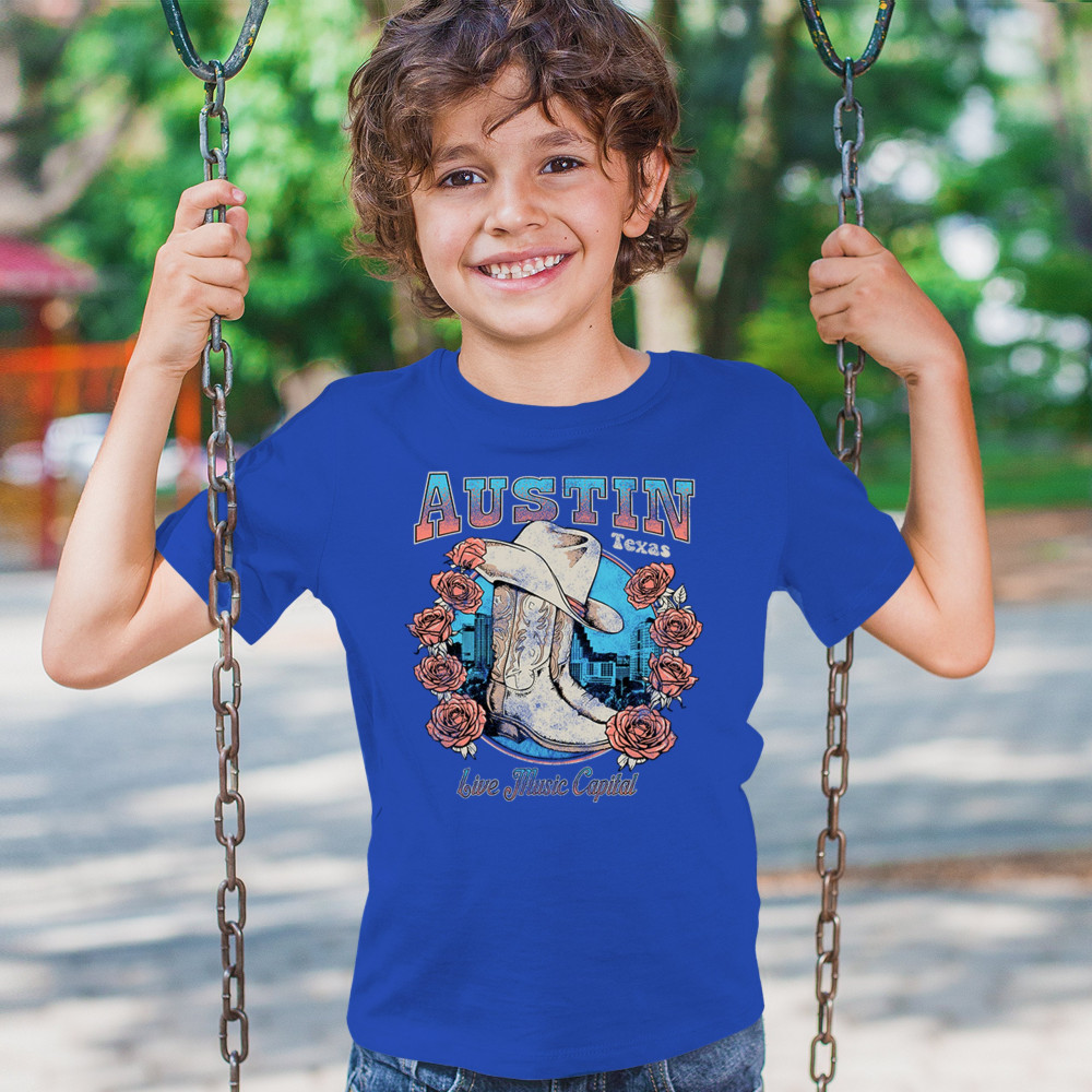Austin TX Live Music Capital comes alive in this vintage cowgirl boots and hat design, accented by roses and the city skyline. Perfect for lovers of country music, honkytonk vibes, and western chic, this design embodies southern spirit, rustic grit, and the proud Americana aesthetic of Texas’ iconic music scene.