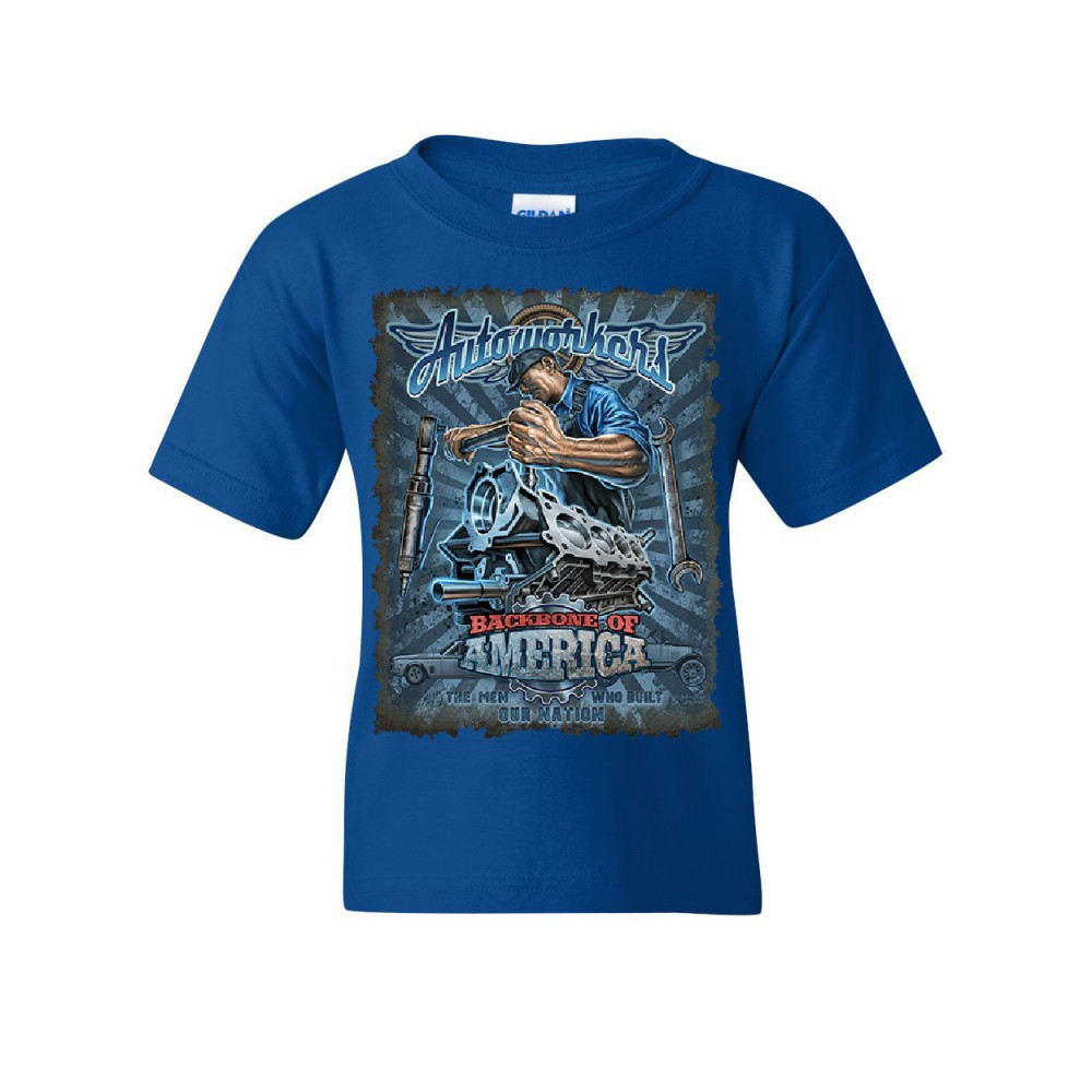 AUTOWORKERS - BACKBONE OF AMERICA autoworkers backbone of america youth t-shirt car motor mechanic union kids tee royal blue