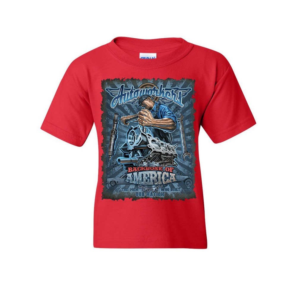 AUTOWORKERS - BACKBONE OF AMERICA autoworkers backbone of america youth t-shirt car motor mechanic union kids tee red