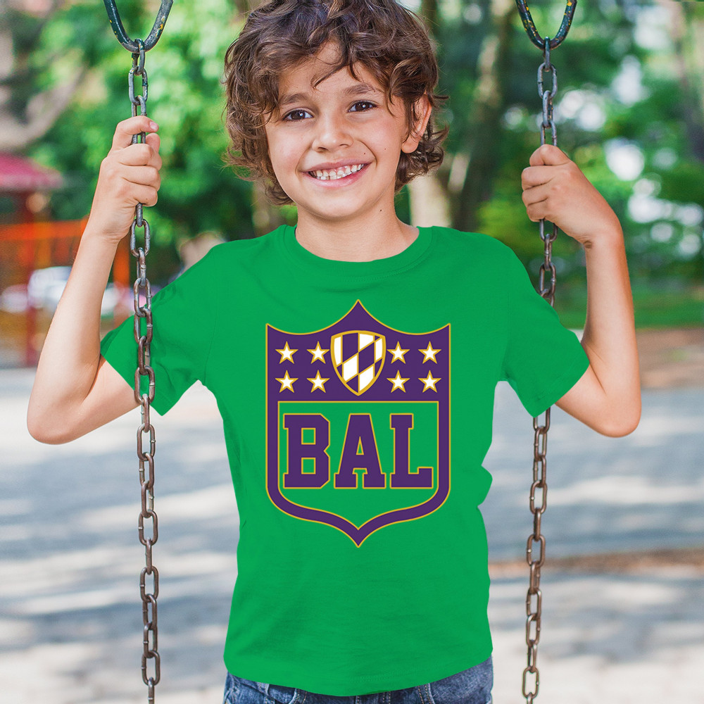 Bold BAL shield design for Baltimore football fans. Vintage sports shirt, collegiate style, and perfect Game Day Baltimore tee.