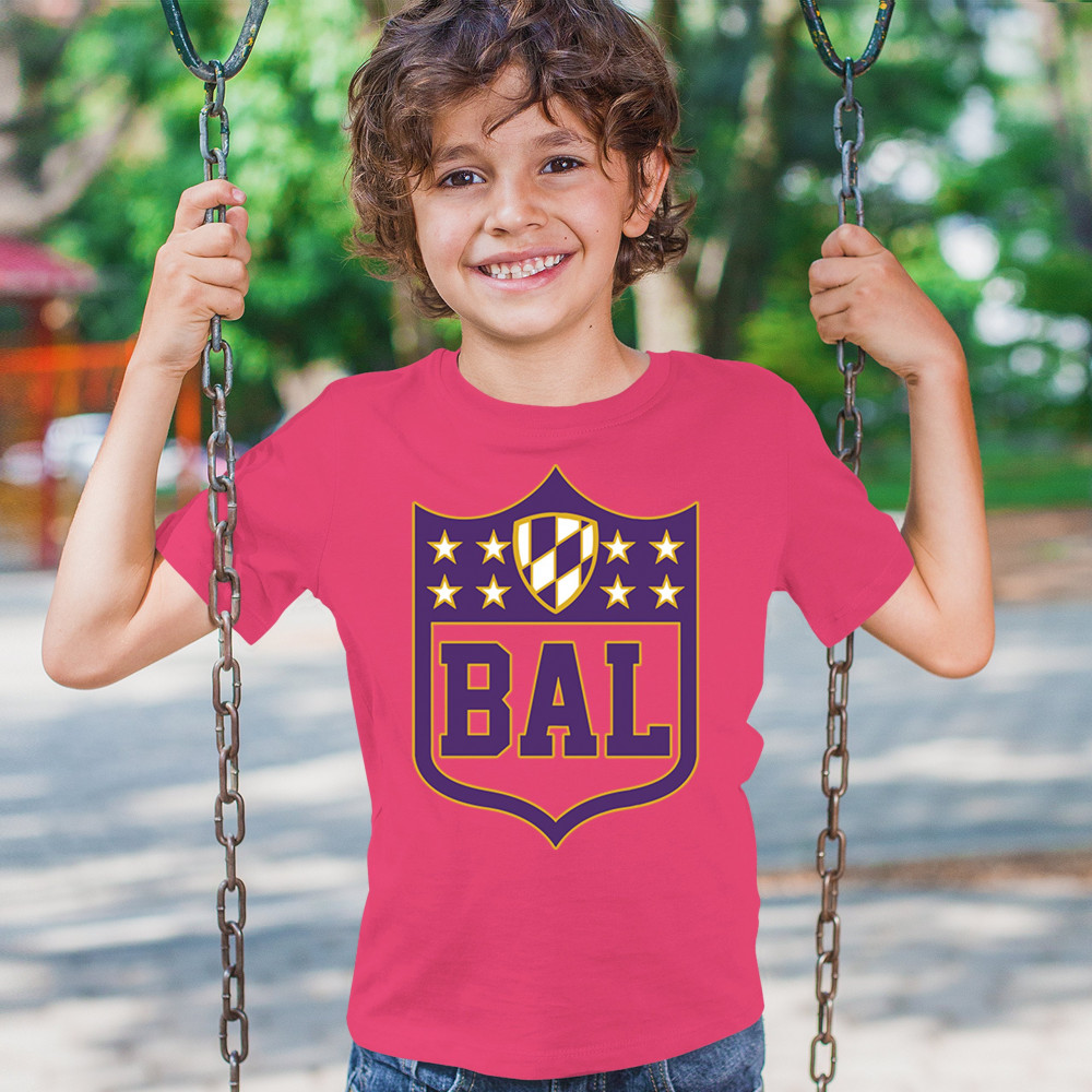 Bold BAL shield design for Baltimore football fans. Vintage sports shirt, collegiate style, and perfect Game Day Baltimore tee.