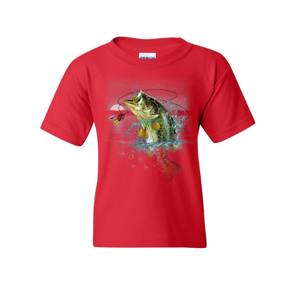 BASS FISHING youth t-shirt fisherman camping hobby angler lake river kids tee red