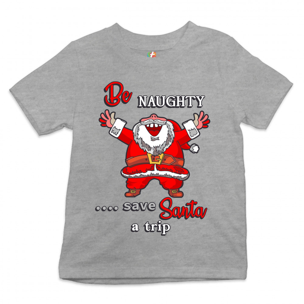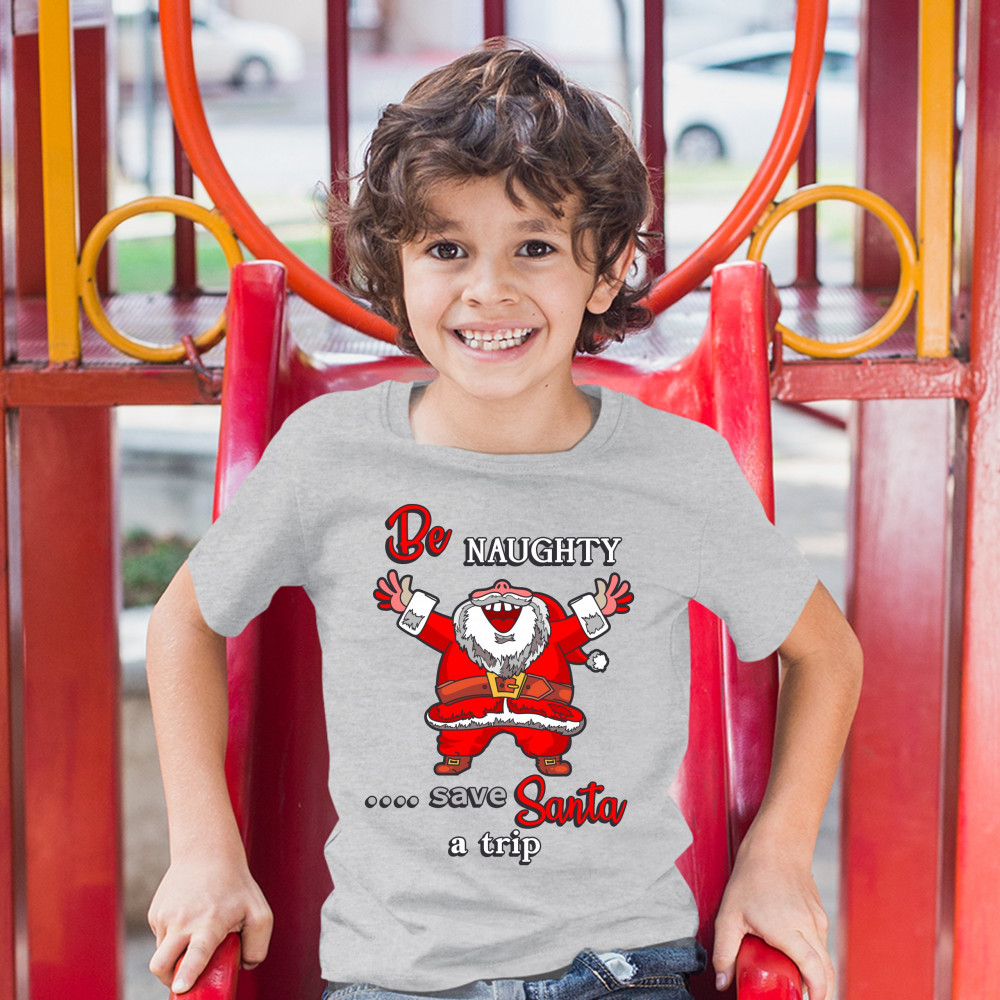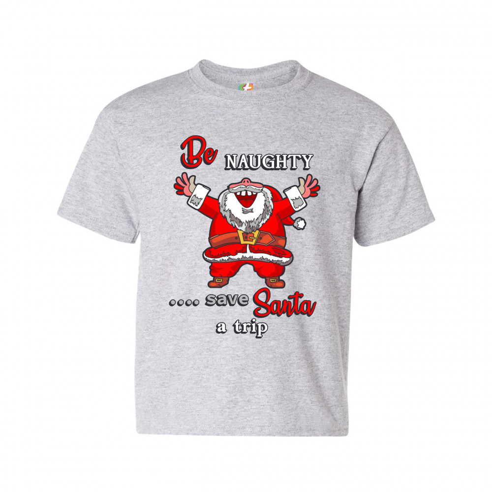 BE NAUGHTY SAVE SANTA A TRIP youth t-shirt holiday spirit christmas eve kids gray