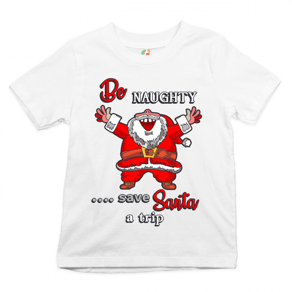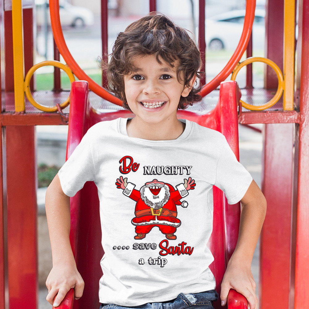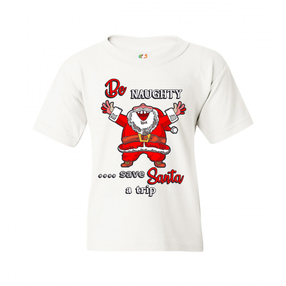BE NAUGHTY SAVE SANTA A TRIP youth t-shirt holiday spirit christmas eve kids white