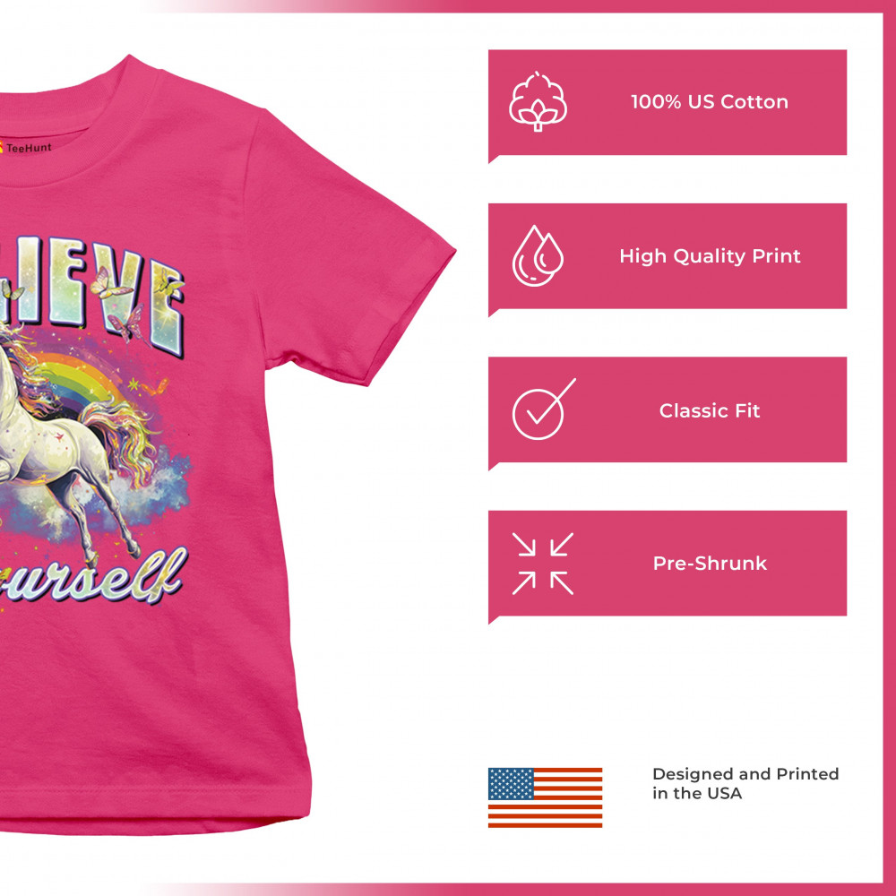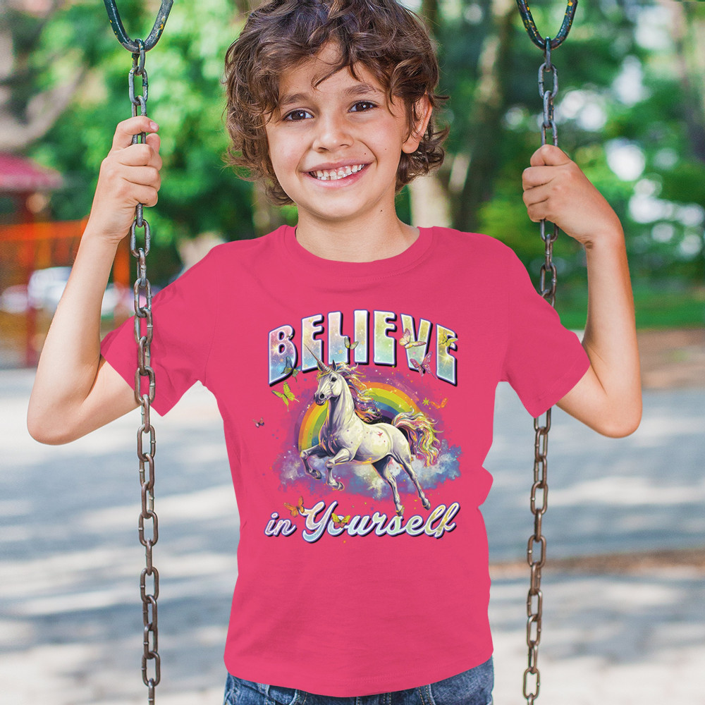 Believe in Yourself unicorn rainbow design with whimsical unicorn shirt, fantasy rainbow style, enchanted unicorn magic, galaxy sparkle, and positivity.