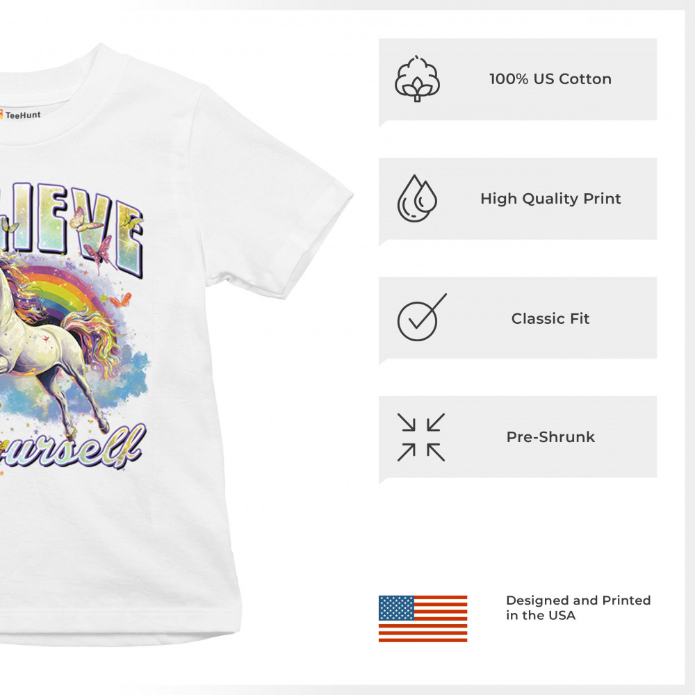 Bring fairytale magic into your everyday life with this Believe in Yourself unicorn rainbow design. Featuring whimsical unicorn shirt details, fantasy rainbow shirt colors, and enchanted unicorn shirt sparkle, it inspires positivity and confidence. A magical rainbow unicorn and galaxy unicorn shirt full of charm, sparkle unicorn shirt vibes, and uplifting energy for all dreamers.