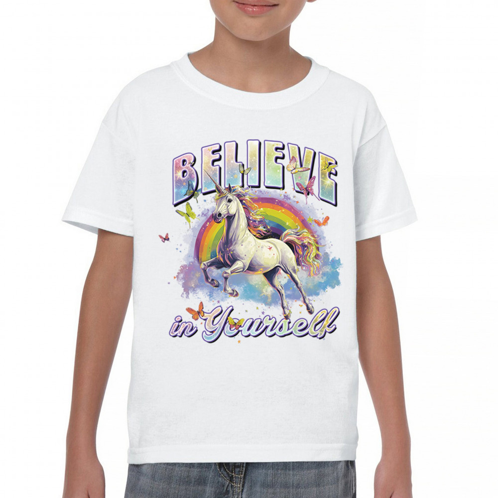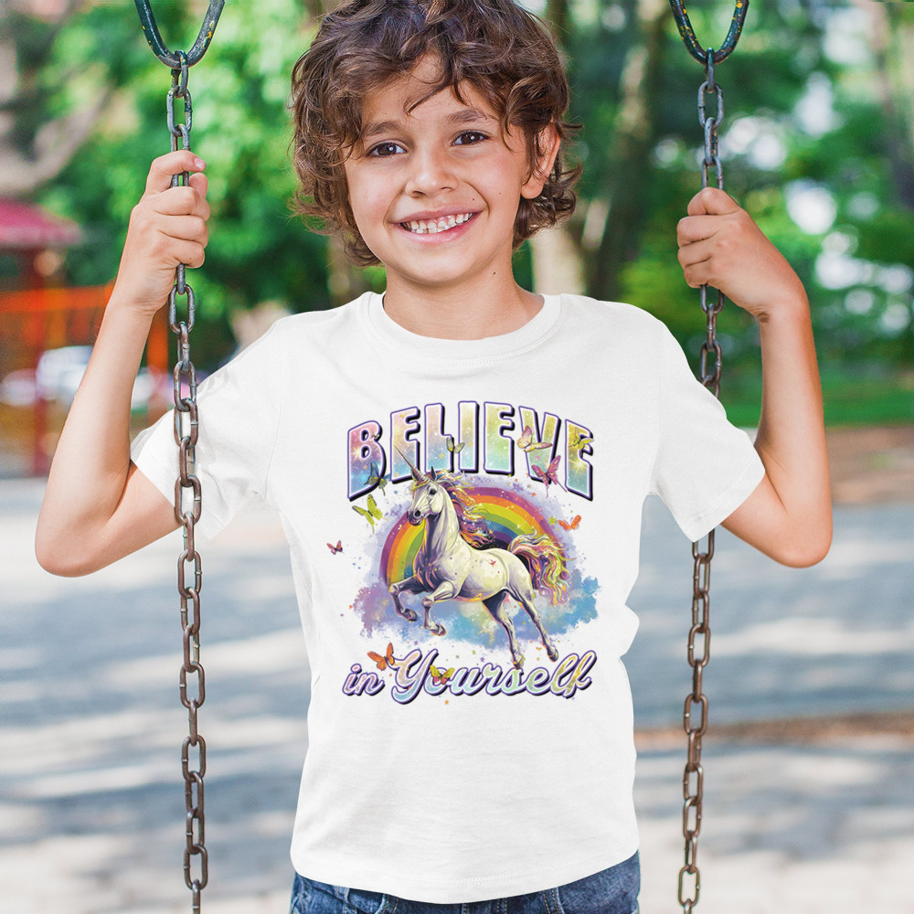 Believe in Yourself unicorn rainbow design with whimsical unicorn shirt, fantasy rainbow style, enchanted unicorn magic, galaxy sparkle, and positivity.