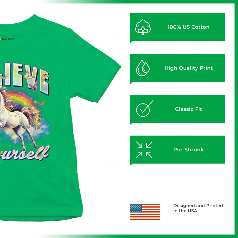 Bring fairytale magic into your everyday life with this Believe in Yourself unicorn rainbow design. Featuring whimsical unicorn shirt details, fantasy rainbow shirt colors, and enchanted unicorn shirt sparkle, it inspires positivity and confidence. A magical rainbow unicorn and galaxy unicorn shirt full of charm, sparkle unicorn shirt vibes, and uplifting energy for all dreamers.