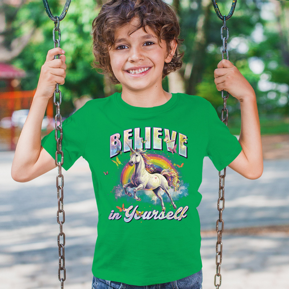 Believe in Yourself unicorn rainbow design with whimsical unicorn shirt, fantasy rainbow style, enchanted unicorn magic, galaxy sparkle, and positivity.