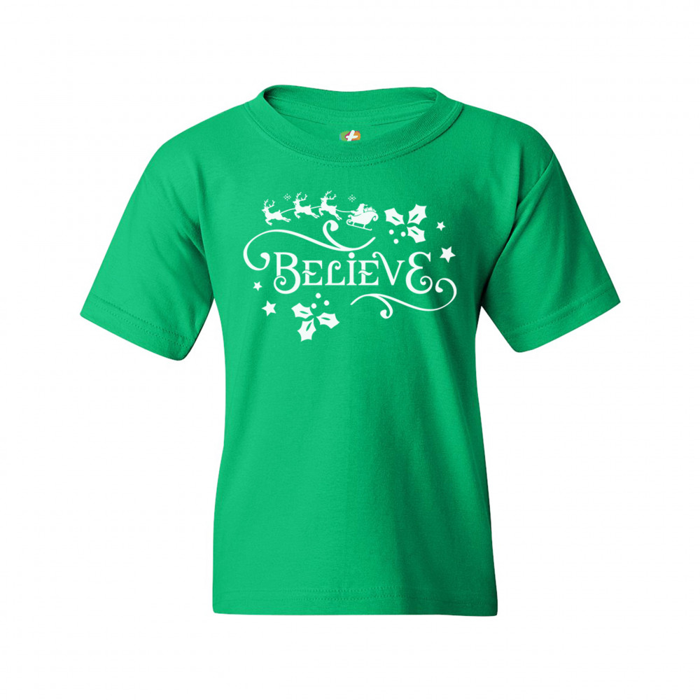 BELIEVE youth t-shirt merry christmas santa sleigh rudolph mistletoe kids green