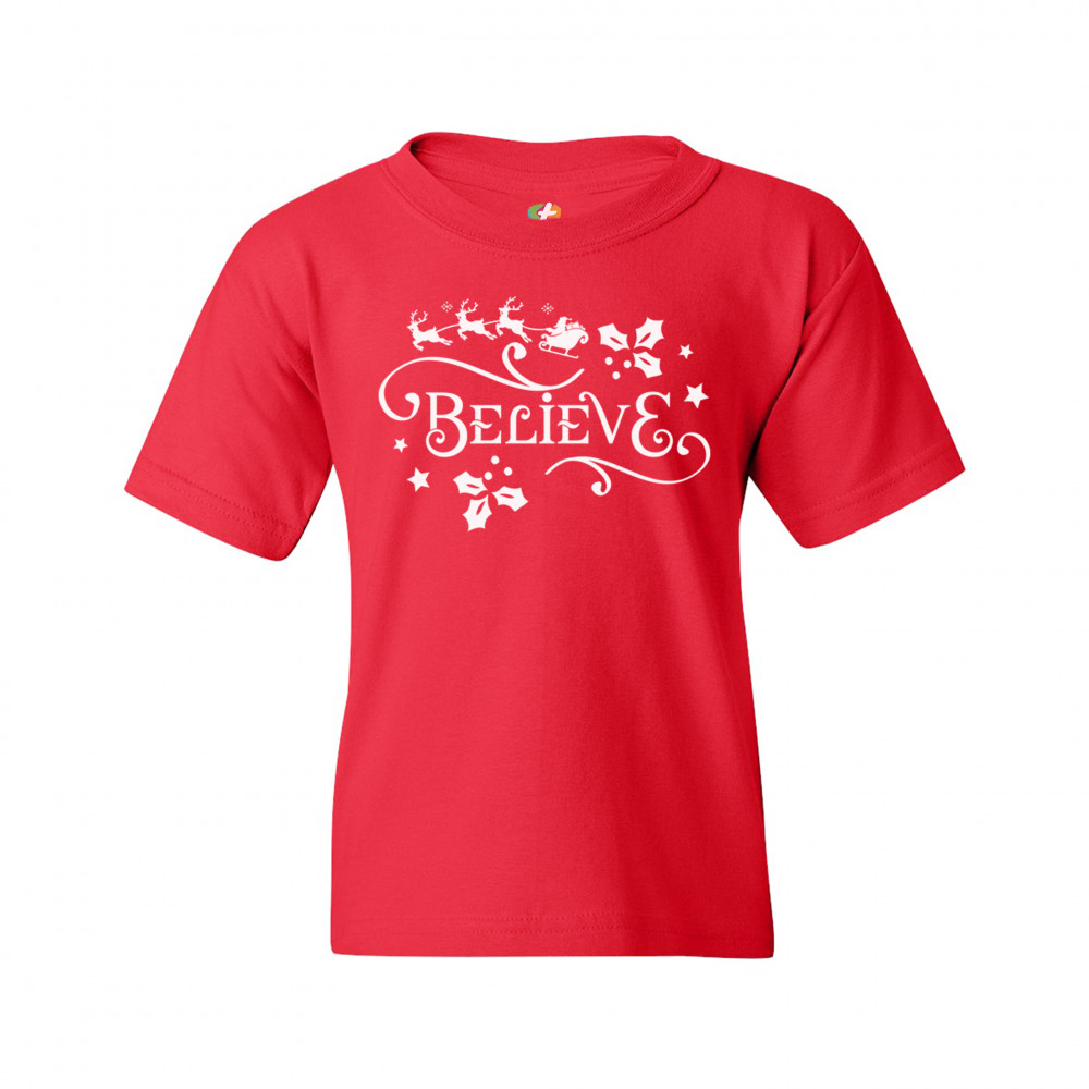 BELIEVE youth t-shirt merry christmas santa sleigh rudolph mistletoe kids red