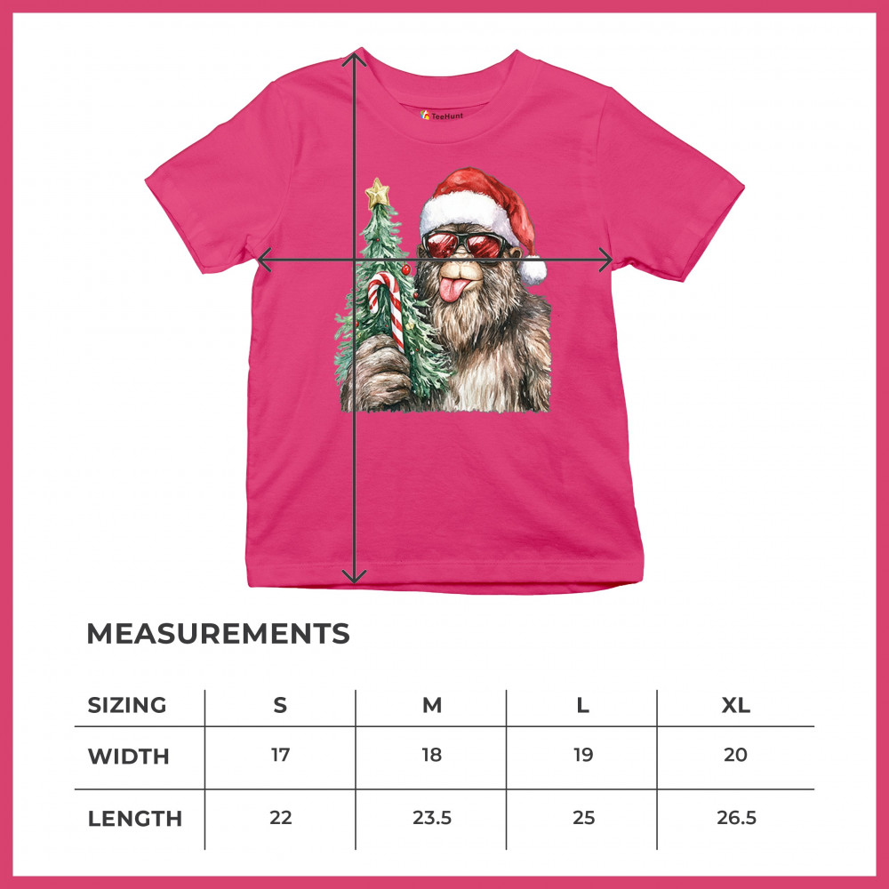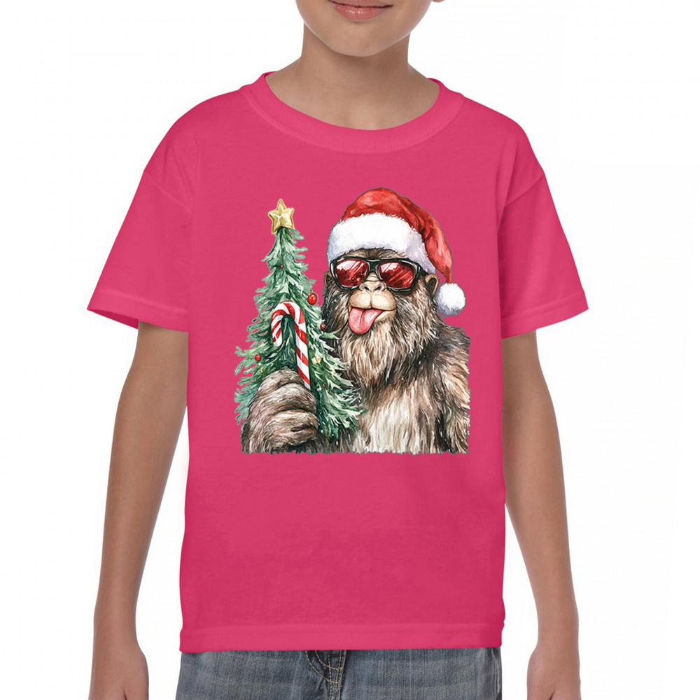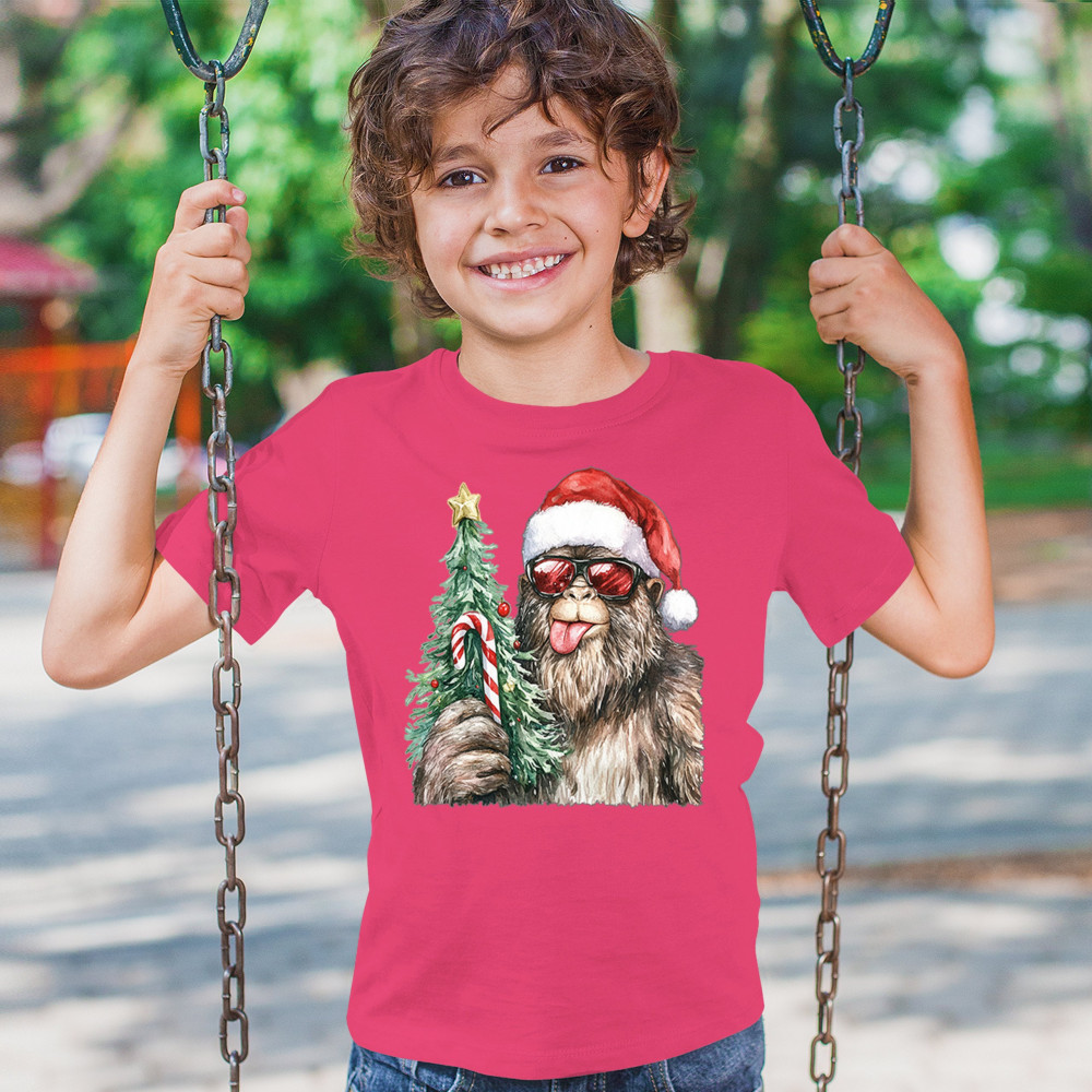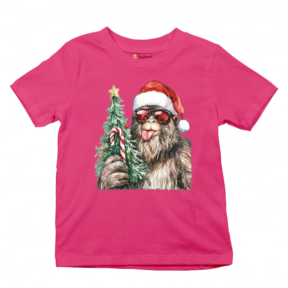 Bigfoot Christmas Santa shirt – festive Sasquatch holiday humor tee with Santa hat design, Xmas tree, candy cane, and funny Christmas style.