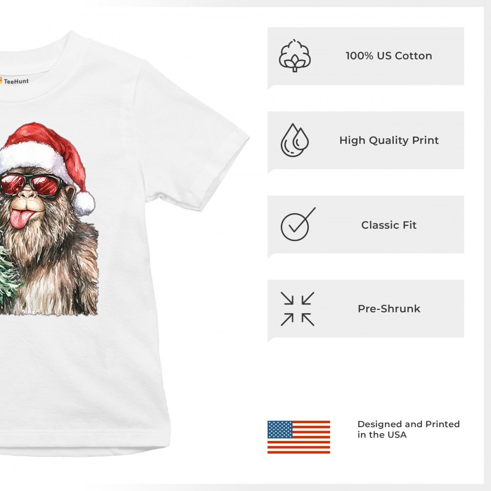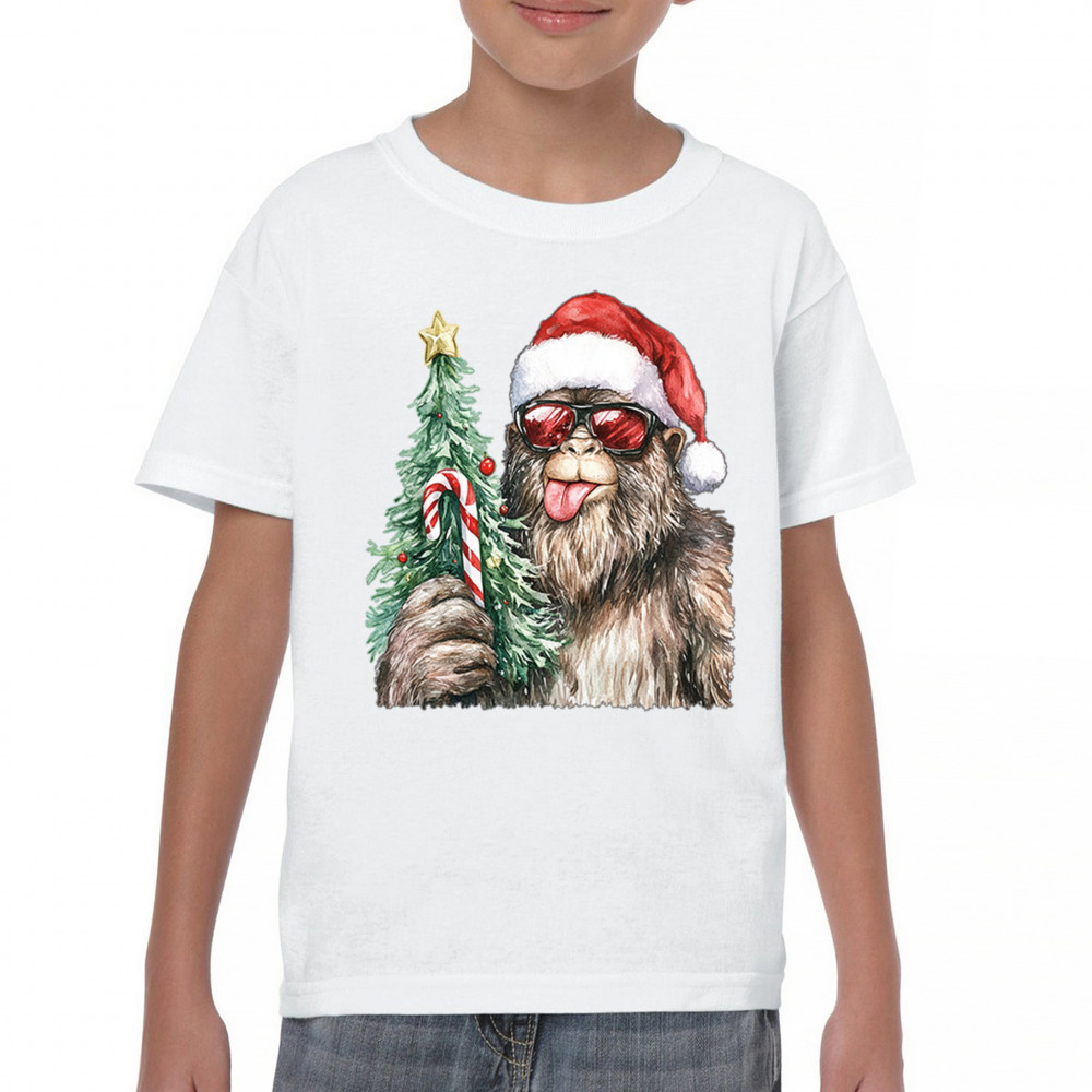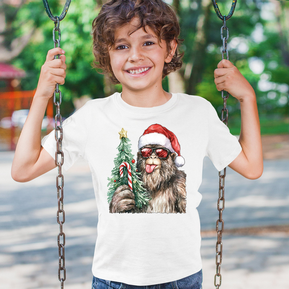 Bigfoot Christmas Santa shirt – festive Sasquatch holiday humor tee with Santa hat design, Xmas tree, candy cane, and funny Christmas style.