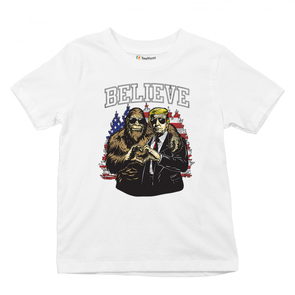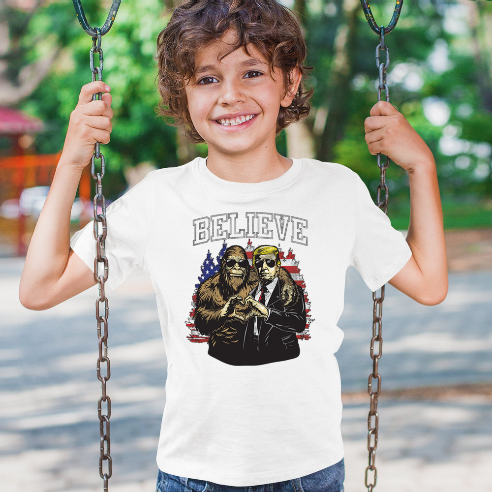 The "Believe" design combines patriotic pride and conservative values with a touch of fun. Featuring Donald J. Trump and a loyal Bigfoot against the American flag, this graphic is perfect for Trump supporters, Republicans, and believers in America First. Celebrate the Red Wave, the 47th President, and the unstoppable fight for victory. Ideal for anyone with unwavering belief in the people's mandate.