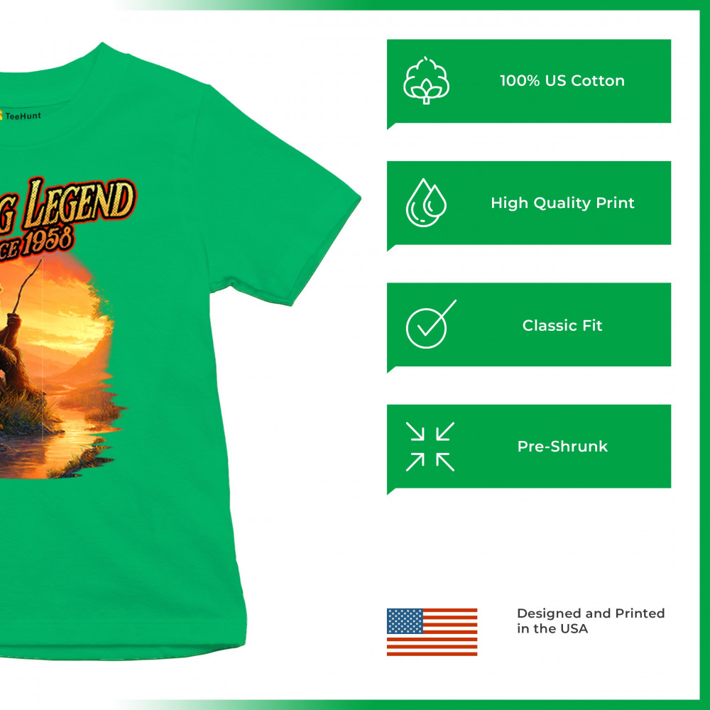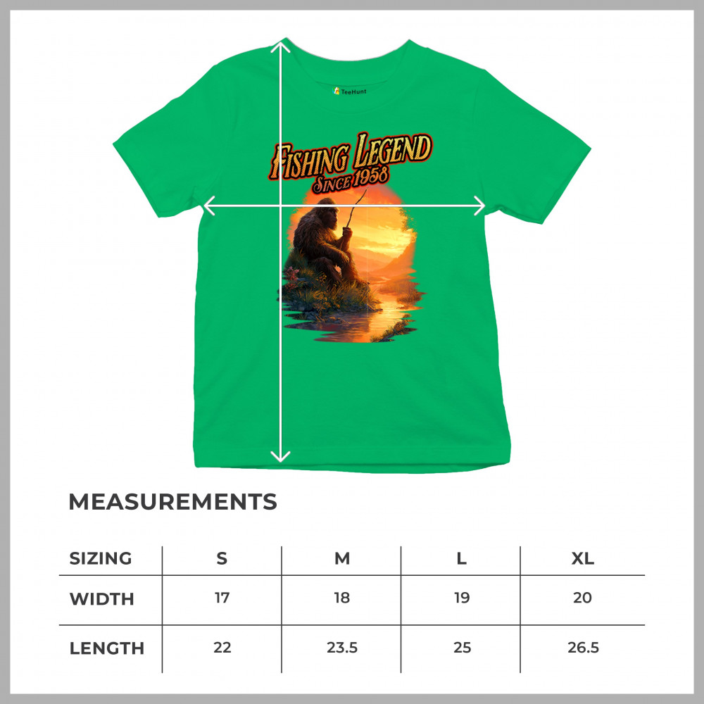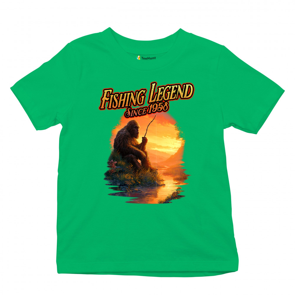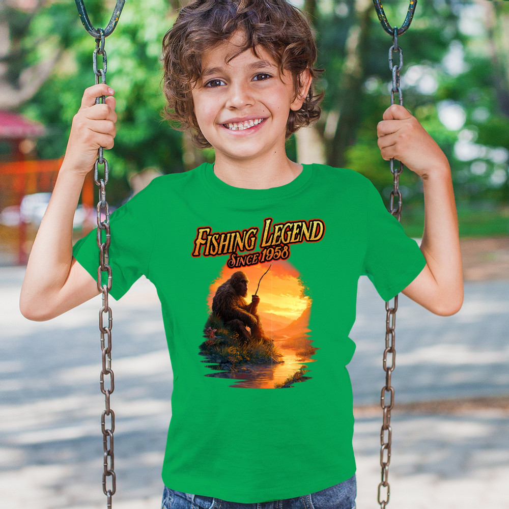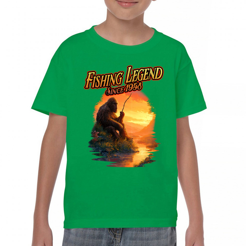 Bigfoot fishing legend design with Sasquatch lifestyle, retro vintage humor, funny wilderness shirt, Father’s Day gift, and campfire style.