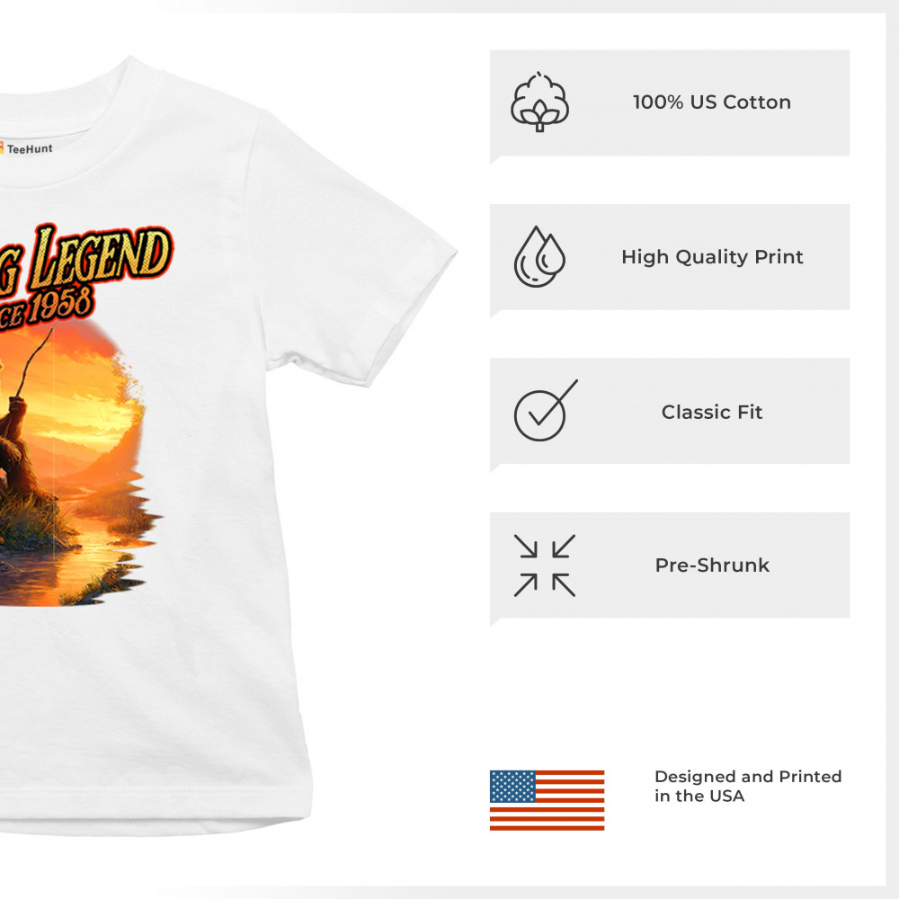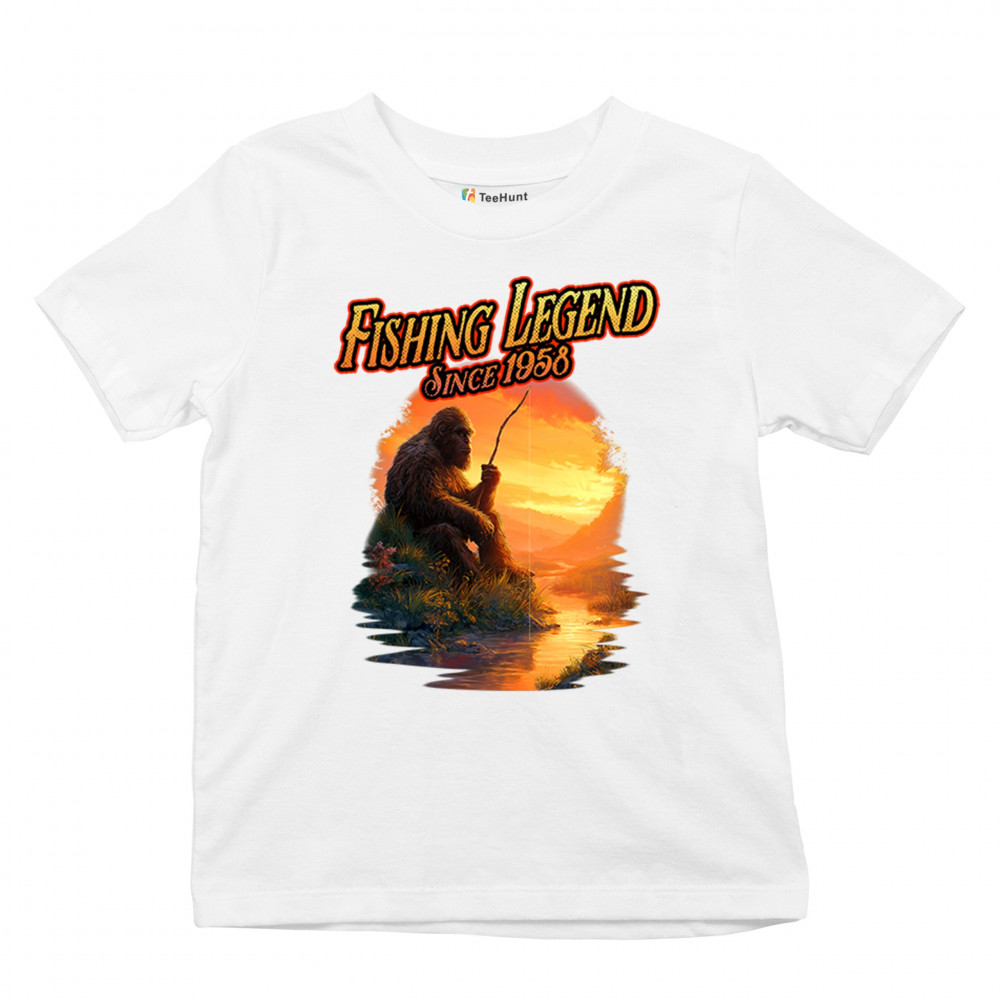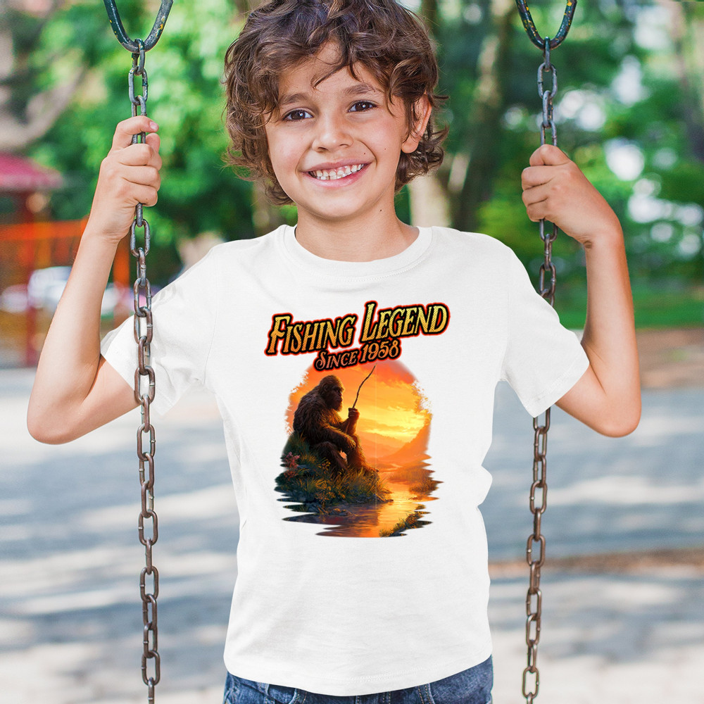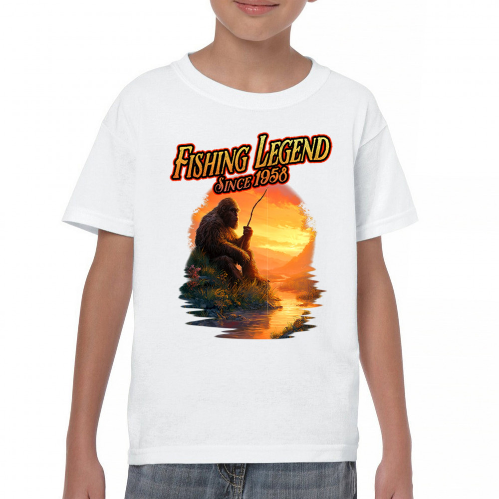 Bigfoot fishing legend design with Sasquatch lifestyle, retro vintage humor, funny wilderness shirt, Father’s Day gift, and campfire style.