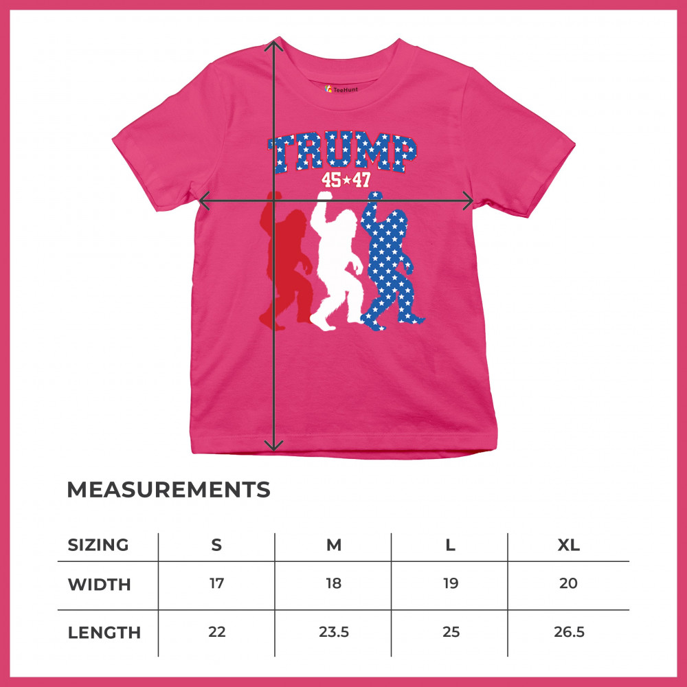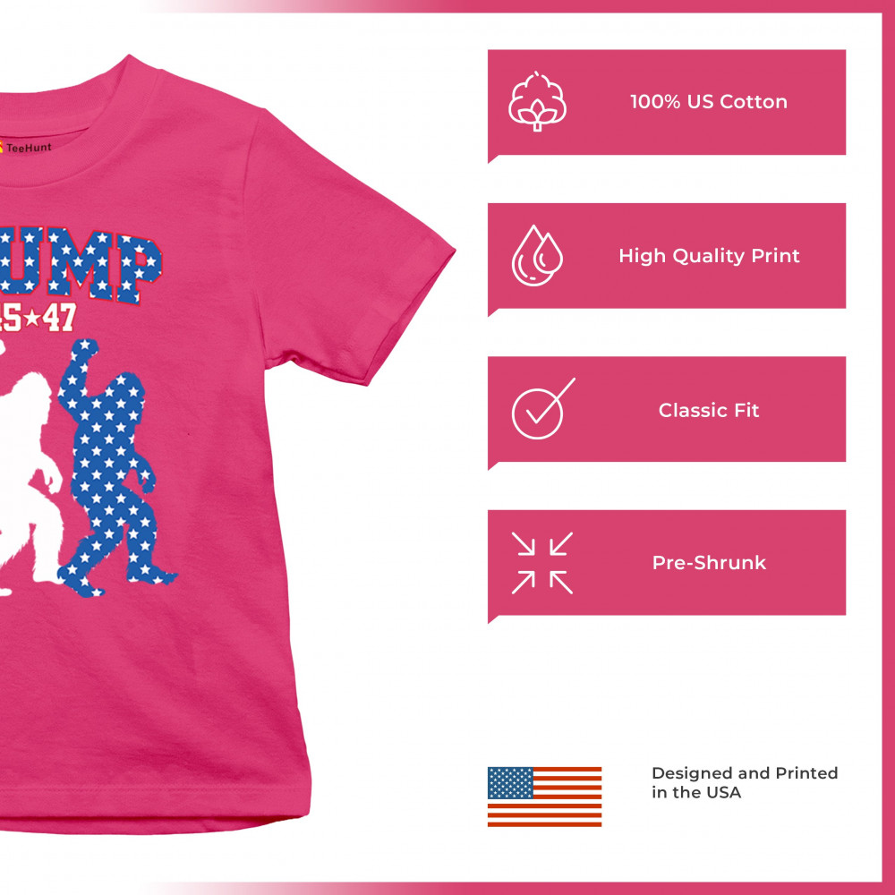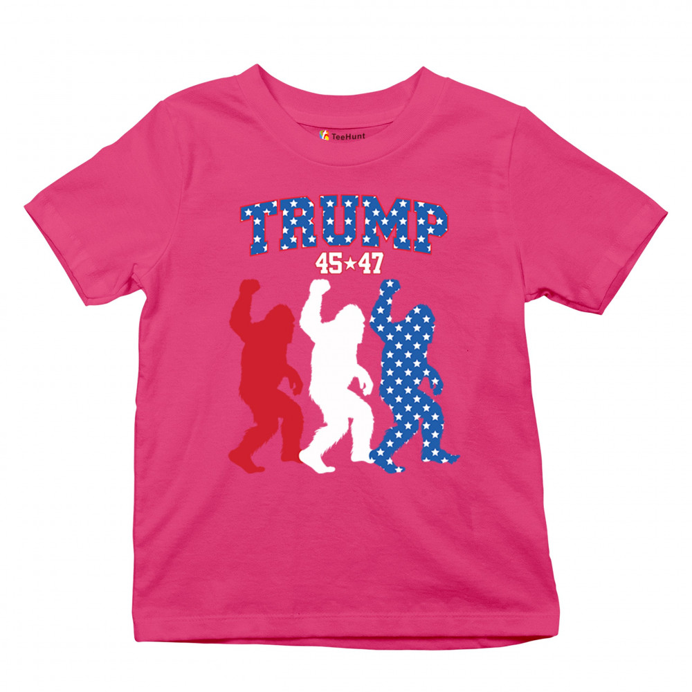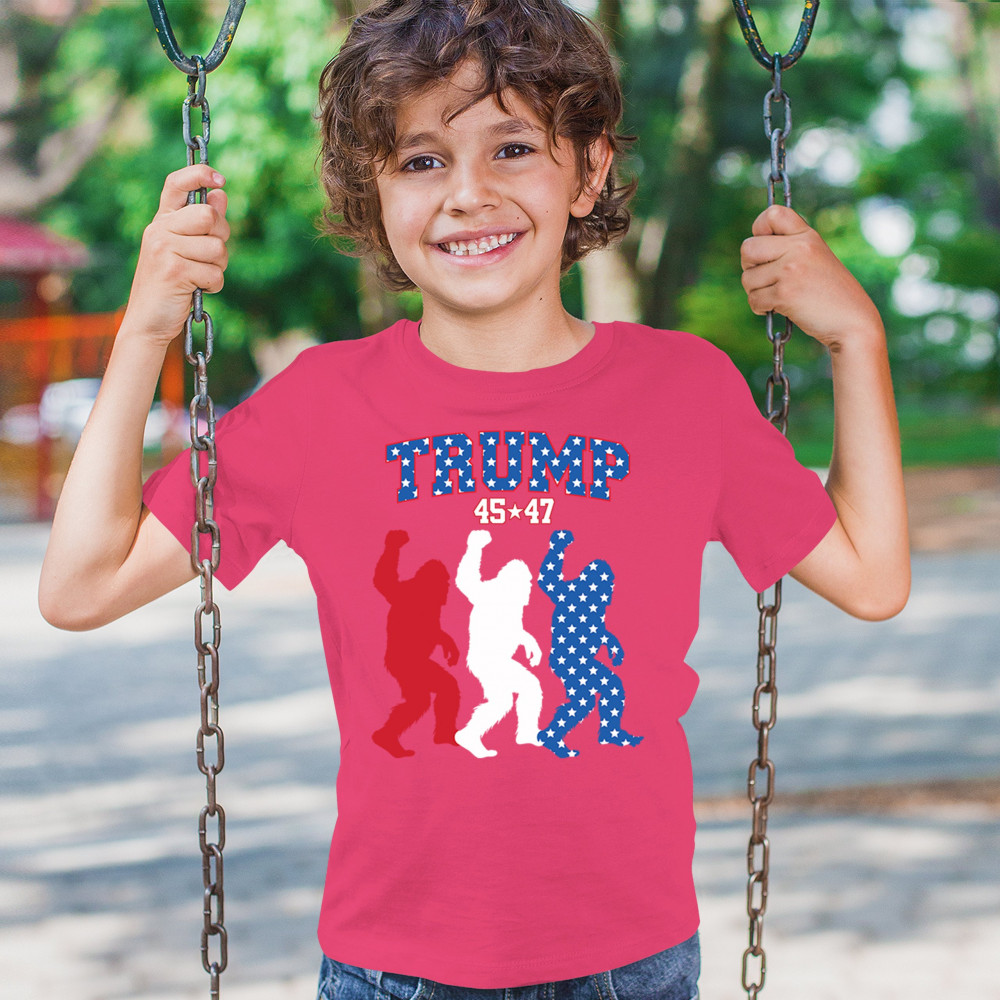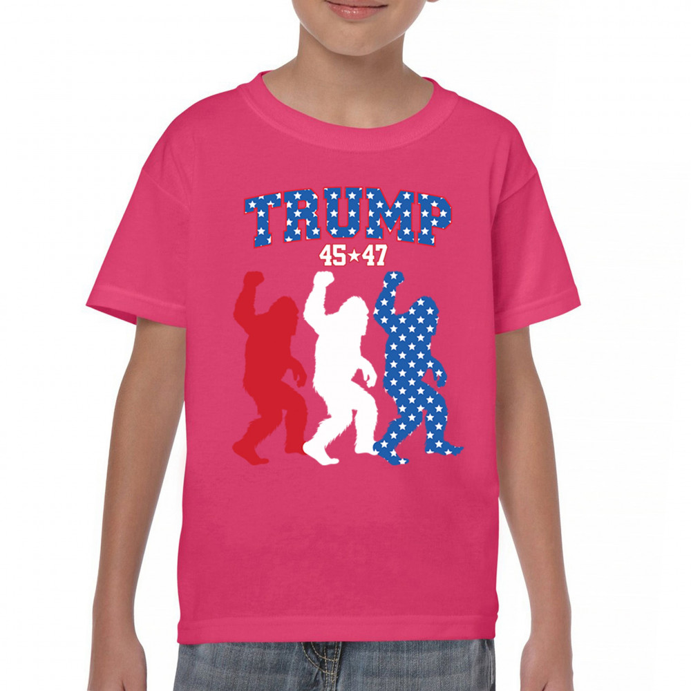 Trump 45/47 Bigfoot design in red, white, and blue with American flag stars. Celebrate patriotism, humor, and the fight for America First values.