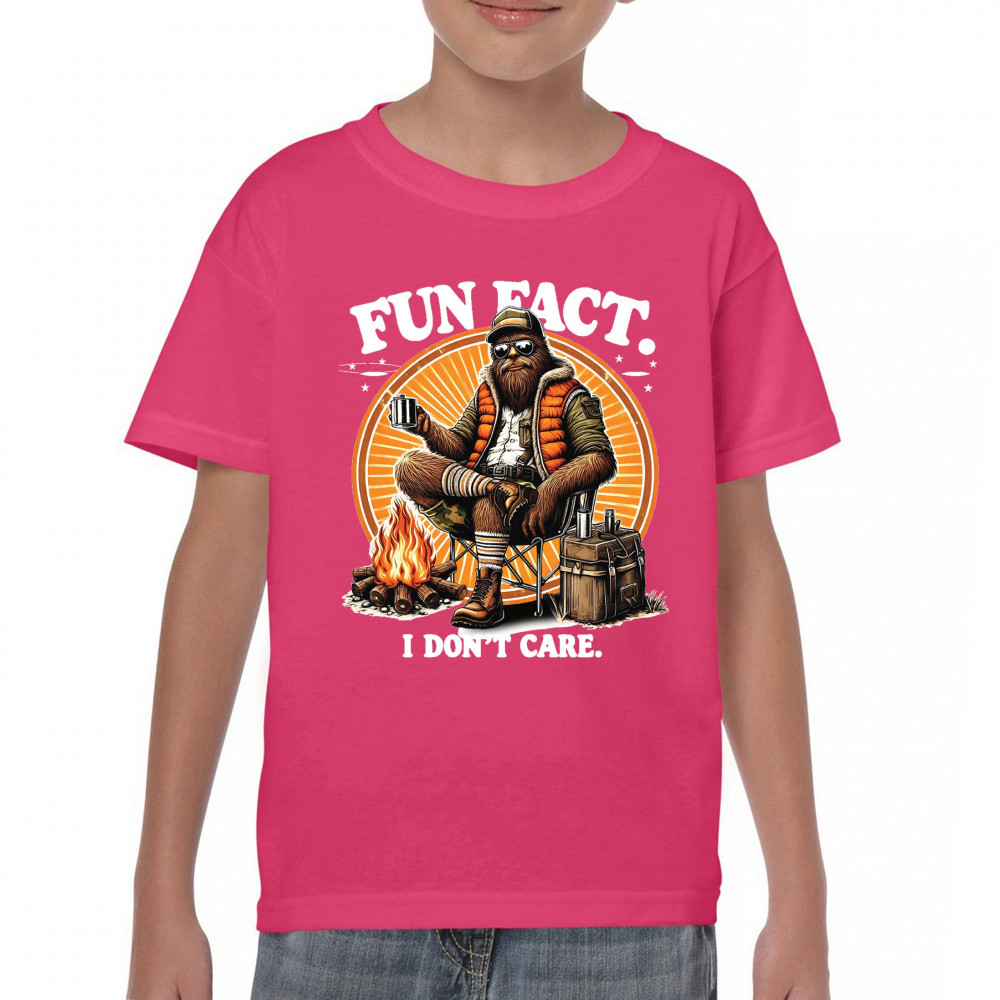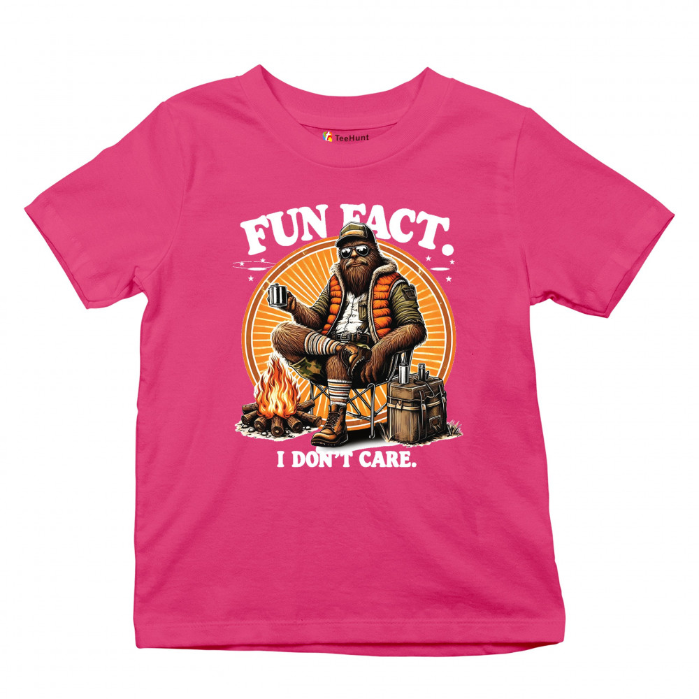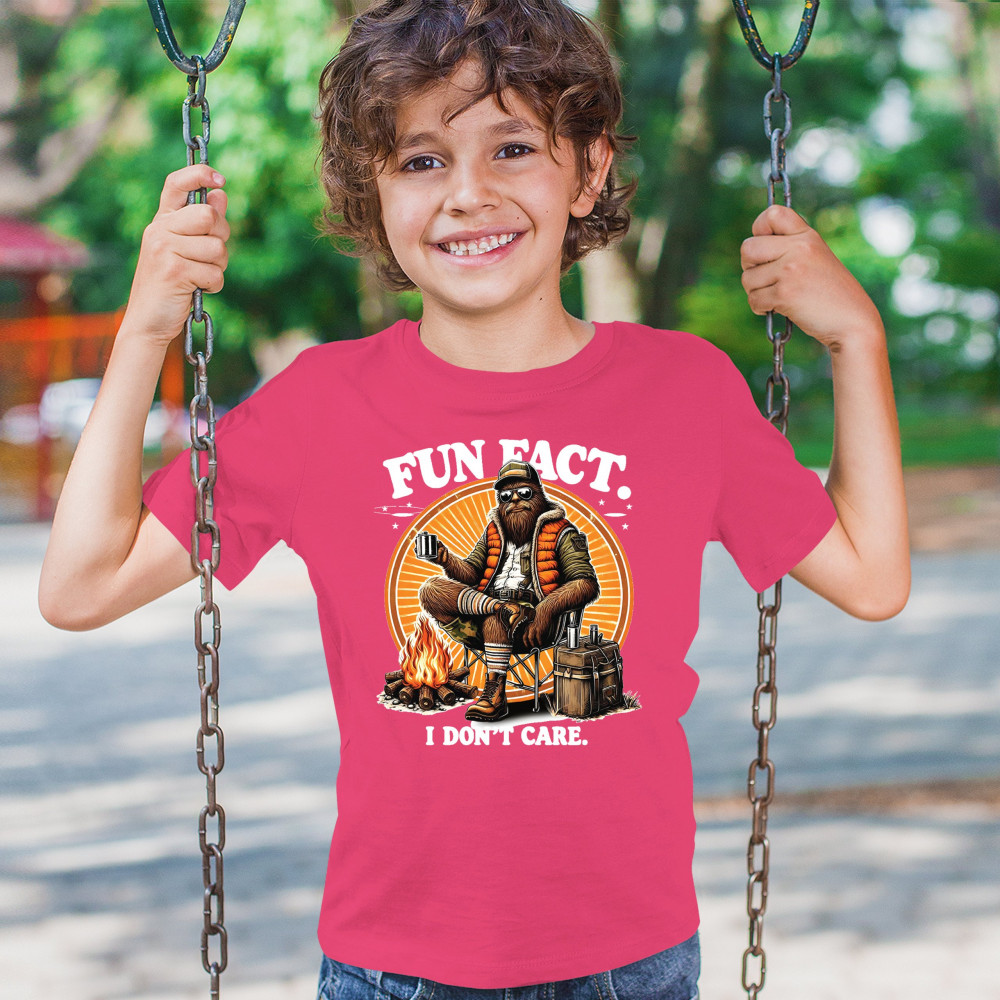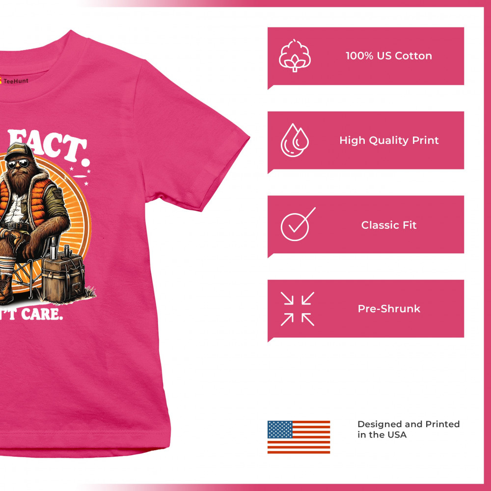 Funny Bigfoot Fun Fact design with cryptid humor, sarcastic outdoors shirt vibe, retro Sasquatch saying, USA pride, and camping adventure style.