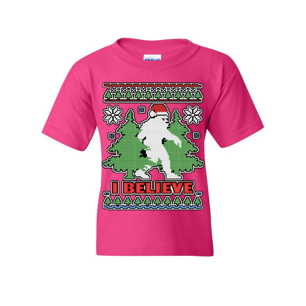 I BELIEVE bigfoot ugly sweatshirt youth t-shirt funny christmas yeti kids tee hot pink